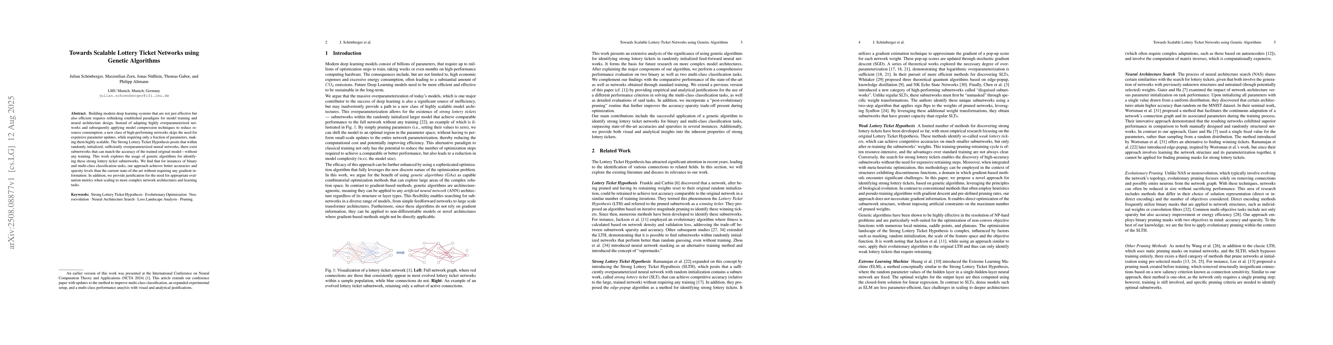 Building modern deep learning systems that are not just effective but also efficient requires rethinking established paradigms for model training and neural architecture design. Instead of adapting highly overparameterized networks and subsequently applying model compression techniques to reduce resource consumption, a new class of high-performing networks skips the need for expensive parameter updates, while requiring only a fraction of parameters, making them highly scalable. The Strong Lottery Ticket Hypothesis posits that within randomly initialized, sufficiently overparameterized neural networks, there exist subnetworks that can match the accuracy of the trained original model-without any training. This work explores the usage of genetic algorithms for identifying these strong lottery ticket subnetworks. We find that for instances of binary and multi-class classification tasks, our approach achieves better accuracies and sparsity levels than the current state-of-the-art without requiring any gradient information. In addition, we provide justification for the need for appropriate evaluation metrics when scaling to more complex network architectures and learning tasks.