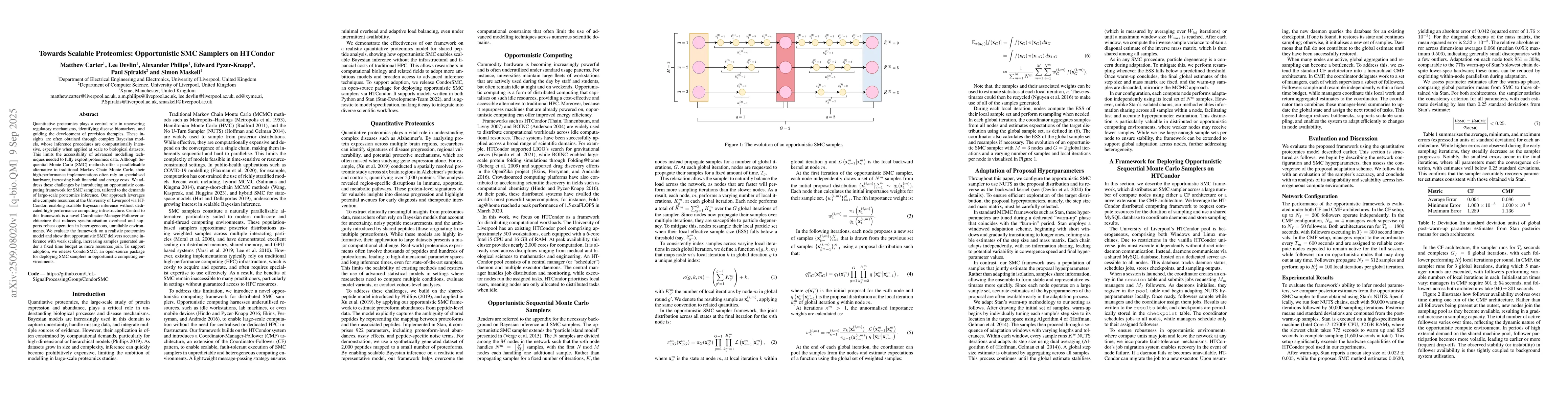 Quantitative proteomics plays a central role in uncovering regulatory mechanisms, identifying disease biomarkers, and guiding the development of precision therapies. These insights are often obtained through complex Bayesian models, whose inference procedures are computationally intensive, especially when applied at scale to biological datasets. This limits the accessibility of advanced modelling techniques needed to fully exploit proteomics data. Although Sequential Monte Carlo (SMC) methods offer a parallelisable alternative to traditional Markov Chain Monte Carlo, their high-performance implementations often rely on specialised hardware, increasing both financial and energy costs. We address these challenges by introducing an opportunistic computing framework for SMC samplers, tailored to the demands of large-scale proteomics inference. Our approach leverages idle compute resources at the University of Liverpool via HTCondor, enabling scalable Bayesian inference without dedicated high-performance computing infrastructure. Central to this framework is a novel Coordinator-Manager-Follower architecture that reduces synchronisation overhead and supports robust operation in heterogeneous, unreliable environments. We evaluate the framework on a realistic proteomics model and show that opportunistic SMC delivers accurate inference with weak scaling, increasing samples generated under a fixed time budget as more resources join. To support adoption, we release CondorSMC, an open-source package for deploying SMC samplers in opportunistic computing environments.