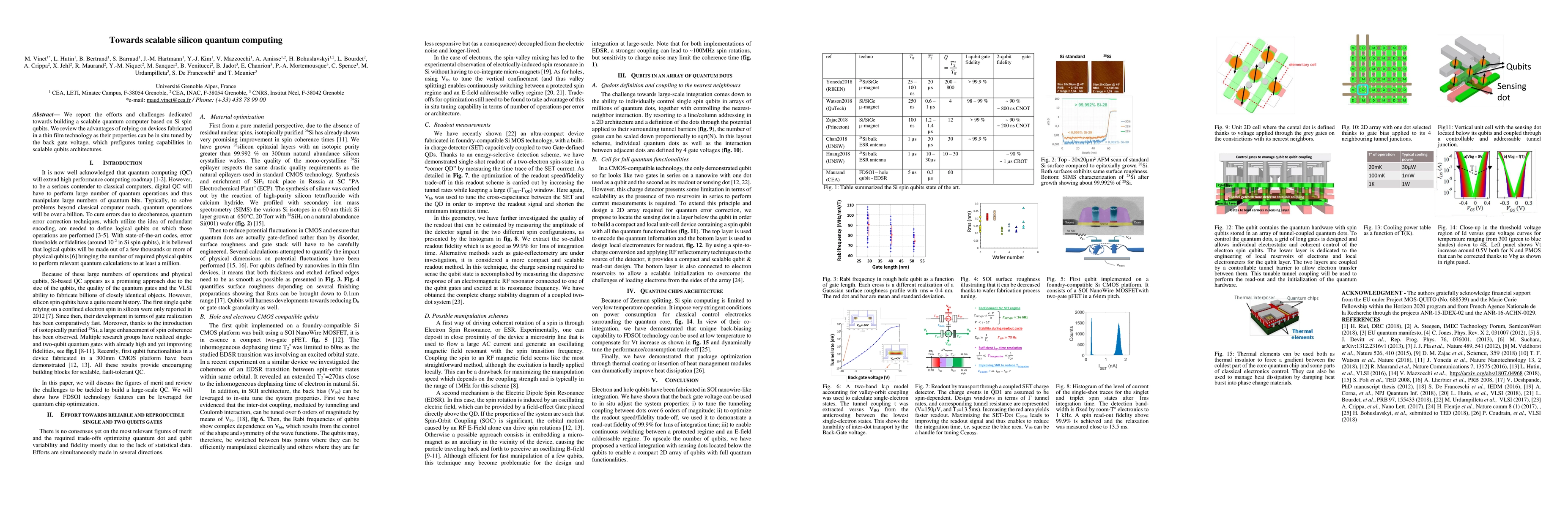 This paper discusses the development and obstacles in constructing a scalable silicon quantum computer using Si spin qubits, highlighting the benefits of thin film technology for tunable properties essential for scalable qubit architectures.