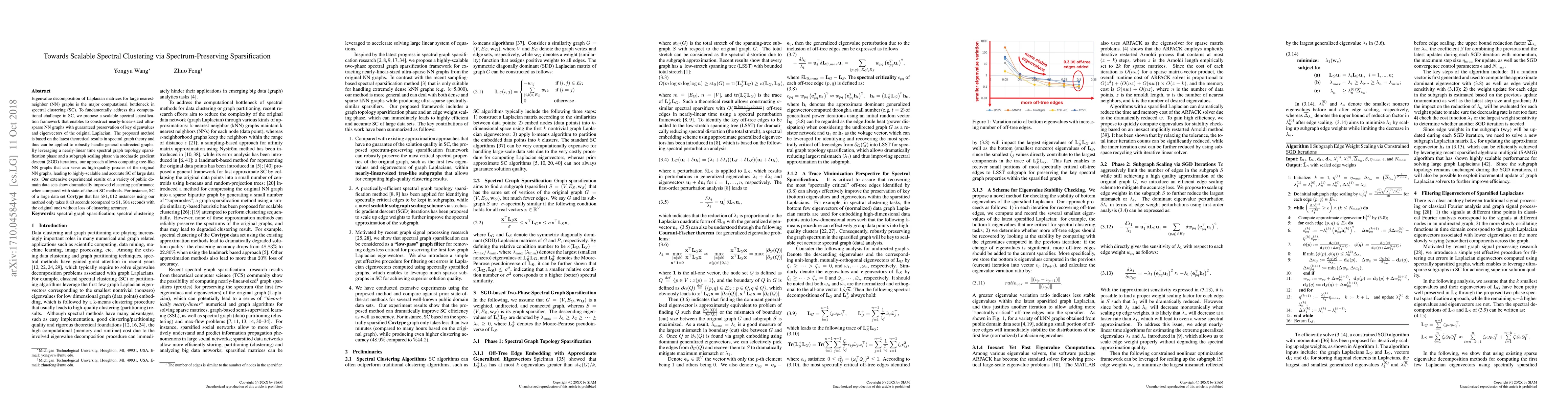 This paper introduces a scalable spectral clustering method via spectrum-preserving graph sparsification, which constructs ultra-sparse nearest-neighbor graphs while maintaining the original graph's spectrum. The method achieves significant speedups in spectral clustering by iteratively adding "spectrally critical" edges to low-stretch spanning trees, using eigenvalue stability and incremental densification schemes.