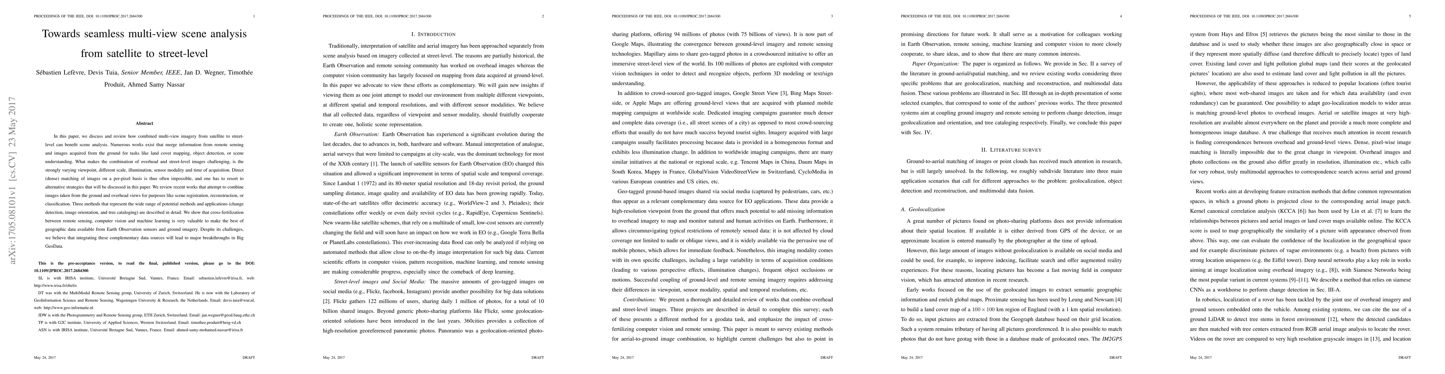 In this paper, we discuss and review how combined multi-view imagery from satellite to street-level can benefit scene analysis. Numerous works exist that merge information from remote sensing and images acquired from the ground for tasks like land cover mapping, object detection, or scene understanding. What makes the combination of overhead and street-level images challenging, is the strongly varying viewpoint, different scale, illumination, sensor modality and time of acquisition. Direct (dense) matching of images on a per-pixel basis is thus often impossible, and one has to resort to alternative strategies that will be discussed in this paper. We review recent works that attempt to combine images taken from the ground and overhead views for purposes like scene registration, reconstruction, or classification. Three methods that represent the wide range of potential methods and applications (change detection, image orientation, and tree cataloging) are described in detail. We show that cross-fertilization between remote sensing, computer vision and machine learning is very valuable to make the best of geographic data available from Earth Observation sensors and ground imagery. Despite its challenges, we believe that integrating these complementary data sources will lead to major breakthroughs in Big GeoData.