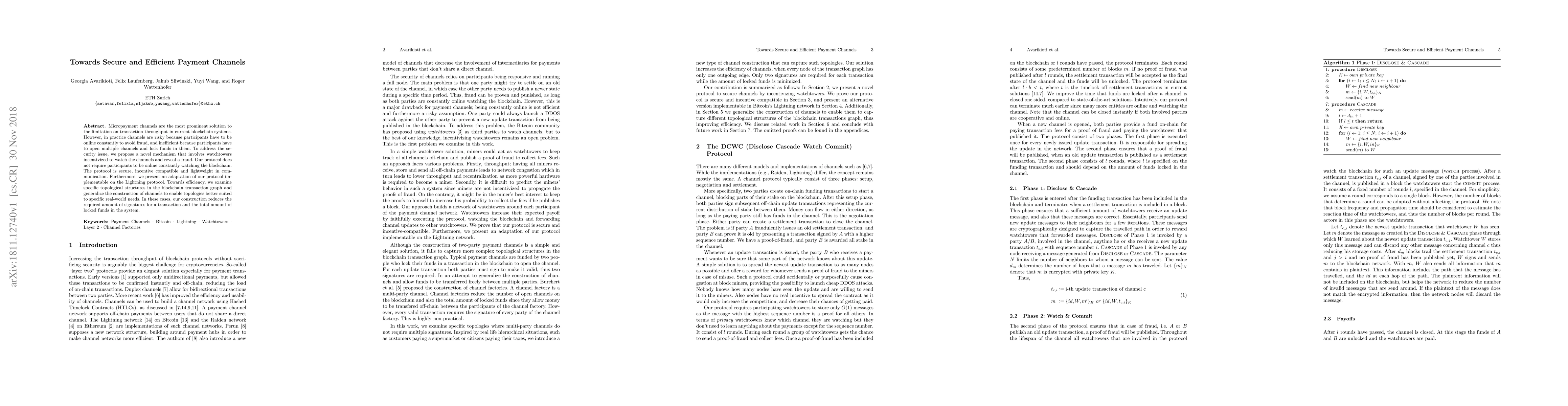 Researchers propose a secure and efficient payment channel mechanism using watchtowers to detect fraud, reducing constant online participation requirements. The protocol also optimizes transaction efficiency by designing channels for specific topologies.
