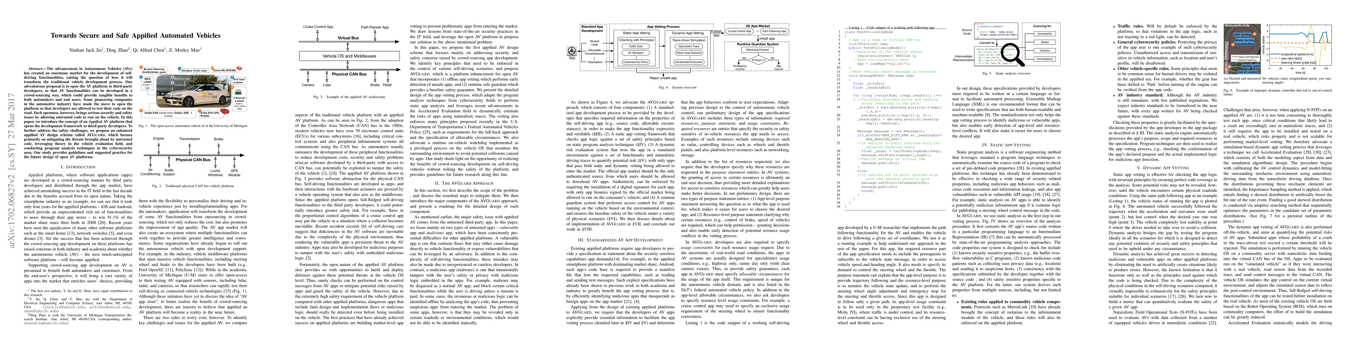 The advancement in Autonomous Vehicles (AVs) has created an enormous market for the development of self-driving functionalities,raising the question of how it will transform the traditional vehicle development process. One adventurous proposal is to open the AV platform to third-party developers, so that AV functionalities can be developed in a crowd-sourcing way, which could provide tangible benefits to both automakers and end users. Some pioneering companies in the automotive industry have made the move to open the platform so that developers are allowed to test their code on the road. Such openness, however, brings serious security and safety issues by allowing untrusted code to run on the vehicle. In this paper, we introduce the concept of an Appified AV platform that opens the development framework to third-party developers. To further address the safety challenges, we propose an enhanced appified AV design schema called AVGuard, which focuses primarily on mitigating the threats brought about by untrusted code, leveraging theory in the vehicle evaluation field, and conducting program analysis techniques in the cybersecurity area. Our study provides guidelines and suggested practice for the future design of open AV platforms.