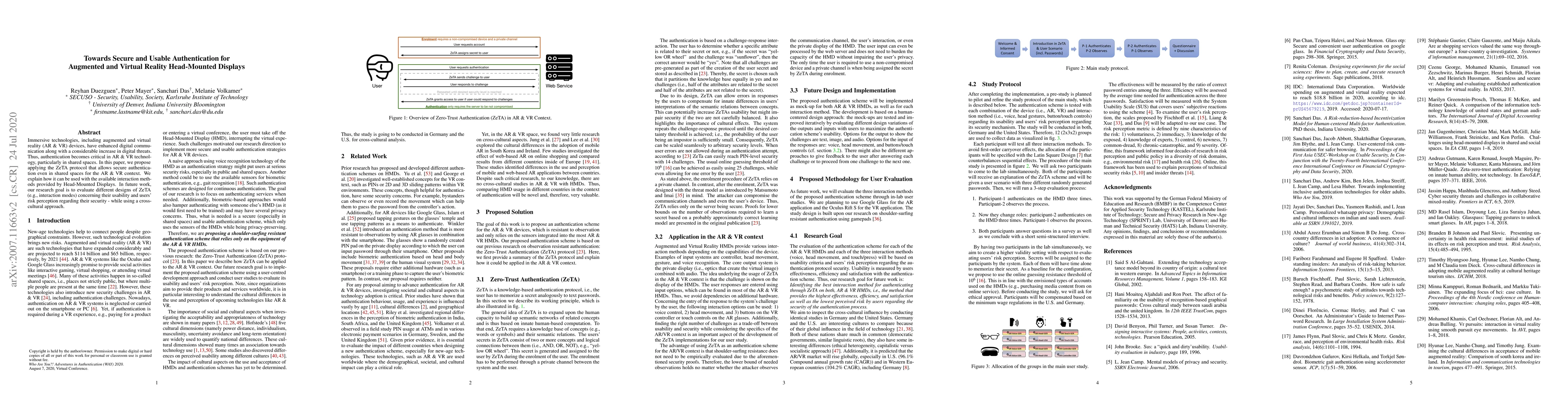 This paper proposes the ZeTA protocol for secure authentication in augmented and virtual reality head-mounted displays, especially in shared spaces. Future research aims to evaluate various ZeTA designs for usability and user risk perception across different cultures.