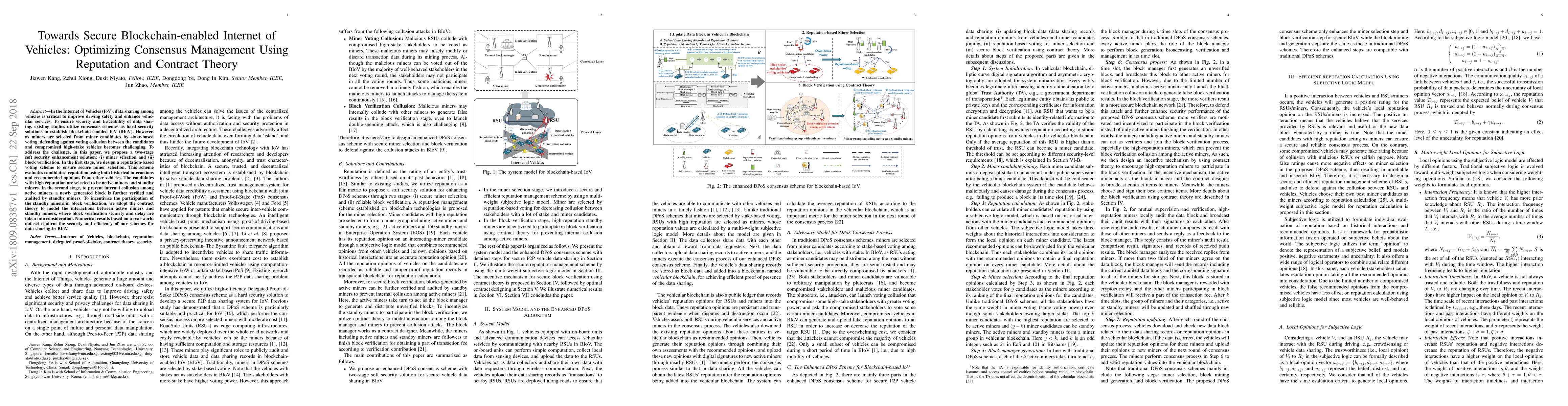 This paper proposes a secure consensus management scheme for blockchain-enabled Internet of Vehicles (BIoV) using reputation-based miner selection and contract theory-based block verification to prevent collusion and enhance data sharing security. The reputation system ensures trustworthy miner selection, while standby miners verify blocks, incentivized by contract theory, to maintain security and efficiency.