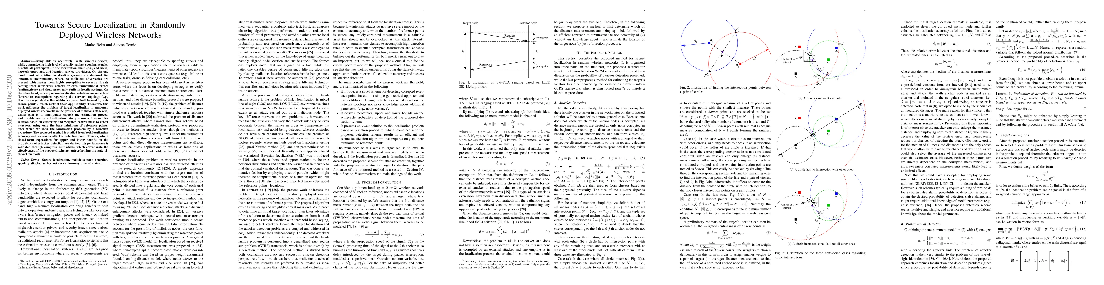 This paper proposes a low-complexity localization method for randomly deployed wireless networks that ensures security against spoofing attacks. It utilizes clustering and weighted central mass to detect attackers, achieving high localization accuracy and effective attacker detection, as validated by computer simulations.
