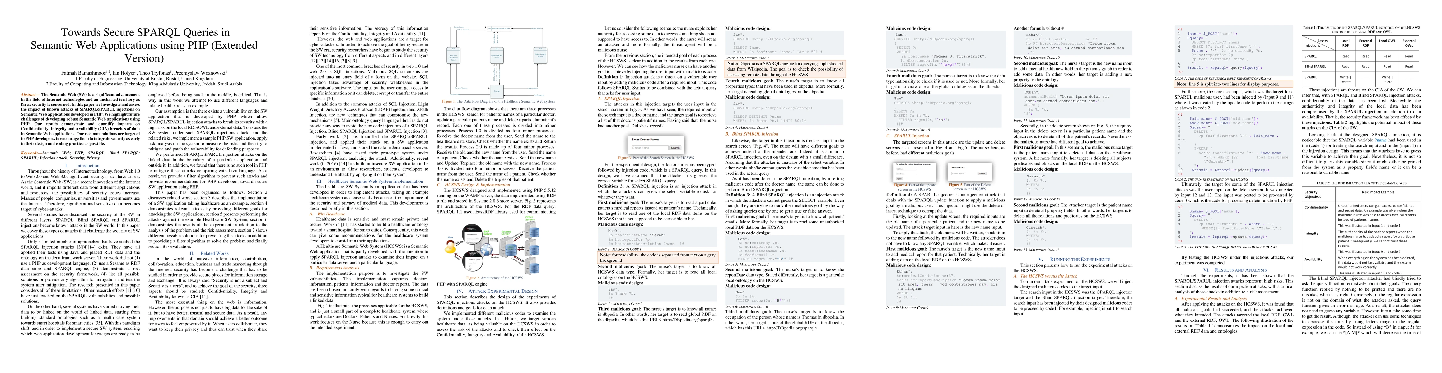 This paper examines SPARQL/SPARUL injection attacks on PHP-based Semantic Web applications, assessing their impact on data confidentiality, integrity, and availability. It provides recommendations for PHP developers to integrate security practices early in the development process to mitigate these risks.
