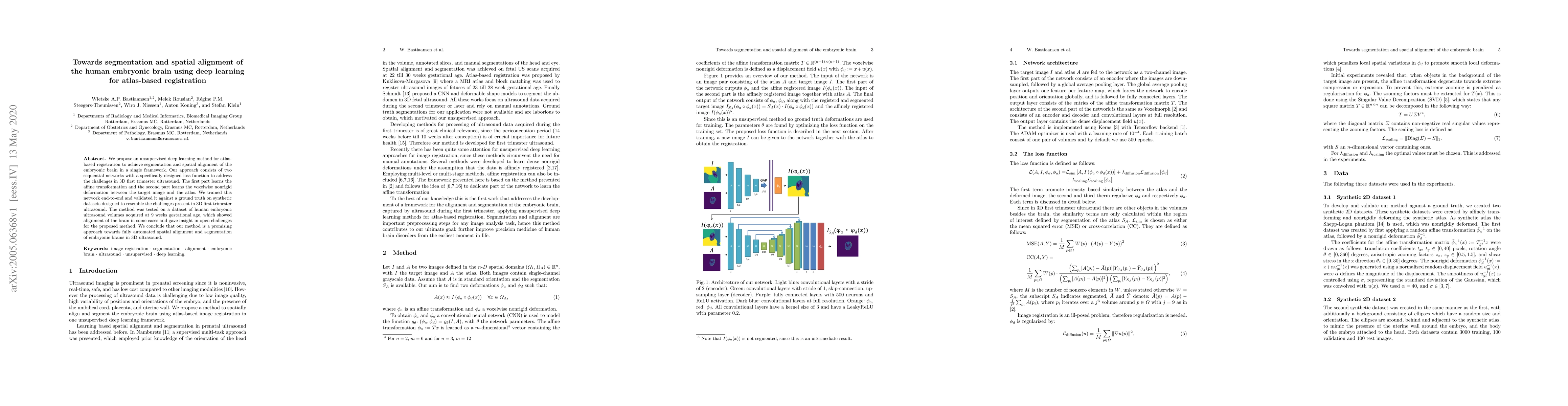 This paper proposes an unsupervised deep learning method for atlas-based registration to segment and spatially align the embryonic brain in 3D ultrasound. The method uses two sequential networks with a custom loss function, achieving promising results on synthetic and real embryonic ultrasound data at 9 weeks gestational age.