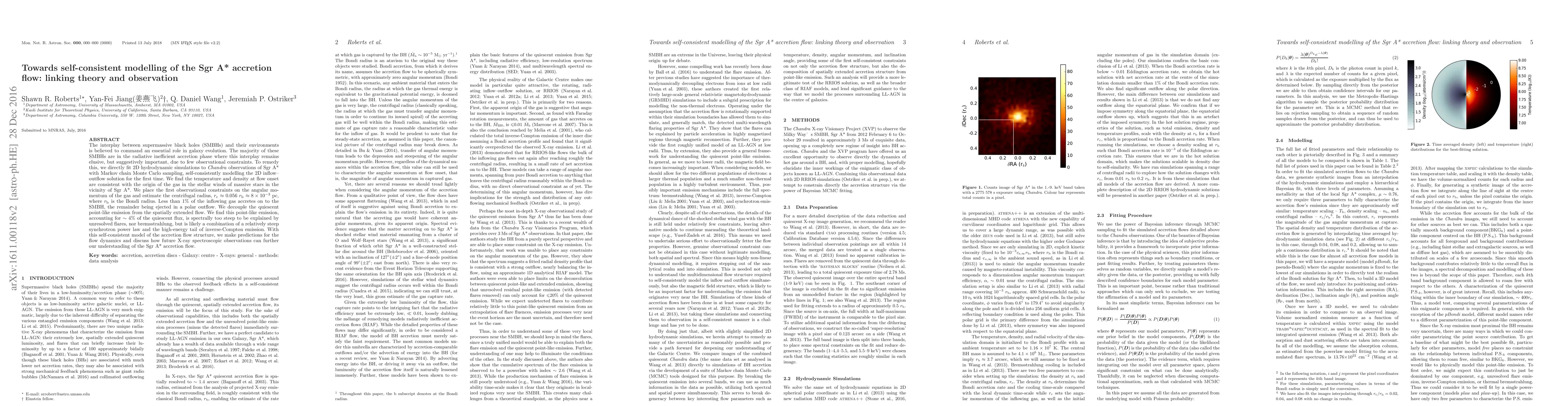 The interplay between supermassive black holes (SMBHs) and their environments is believed to command an essential role in galaxy evolution. The majority of these SMBHs are in the radiative inefficient accretion phase where this interplay remains elusive, but suggestively important, due to few observational constraints. To remedy this, we directly fit 2-D hydrodynamic simulations to Chandra observations of Sgr A* with Markov Chain Monte Carlo sampling, self-consistently modelling the 2-D inflow-outflow solution for the first time. We find the temperature and density at flow onset are consistent with the origin of the gas in the stellar winds of massive stars in the vicinity of Sgr A*. We place the first observational constraints on the angular momentum of the gas and estimate the centrifugal radius, r$_c$ $\approx$ 0.056 r$_b$ $\approx8\times10^{-3}$ pc, where r$_b$ is the Bondi radius. Less than 1\% of the inflowing gas accretes onto the SMBH, the remainder being ejected in a polar outflow. For the first time, we decouple the quiescent point-like emission from the spatially extended flow. We find this point-like emission, accounting for $\sim4$\% of the quiescent flux, is spectrally too steep to be explained by unresolved flares, nor Bremsstrahlung, but is likely a combination of a relatively steep synchrotron powerlaw and the high energy tail of inverse-Compton emission. With this self-consistent model of the accretion flow structure, we make predictions for the flow dynamics and discuss how future X-ray spectroscopic observations can further our understanding of the Sgr A* accretion flow.
