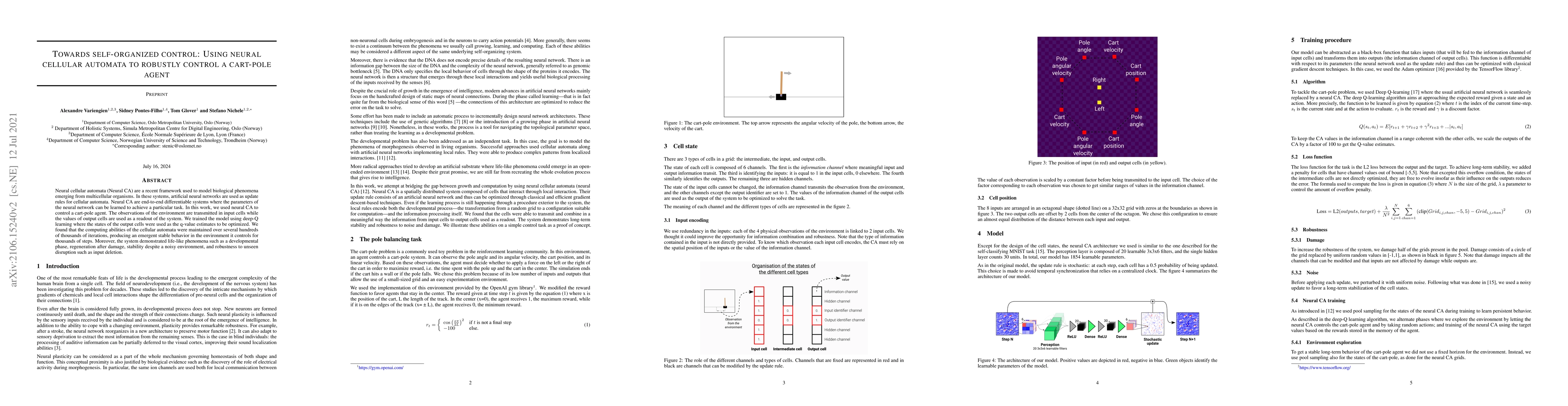 This paper explores the use of neural cellular automata to robustly control a cart-pole agent, demonstrating emergent stable behavior and life-like phenomena such as regeneration, stability, and robustness despite environmental noise and disruptions. The model was trained using deep-Q learning, showing sustained computing abilities over long iterations.