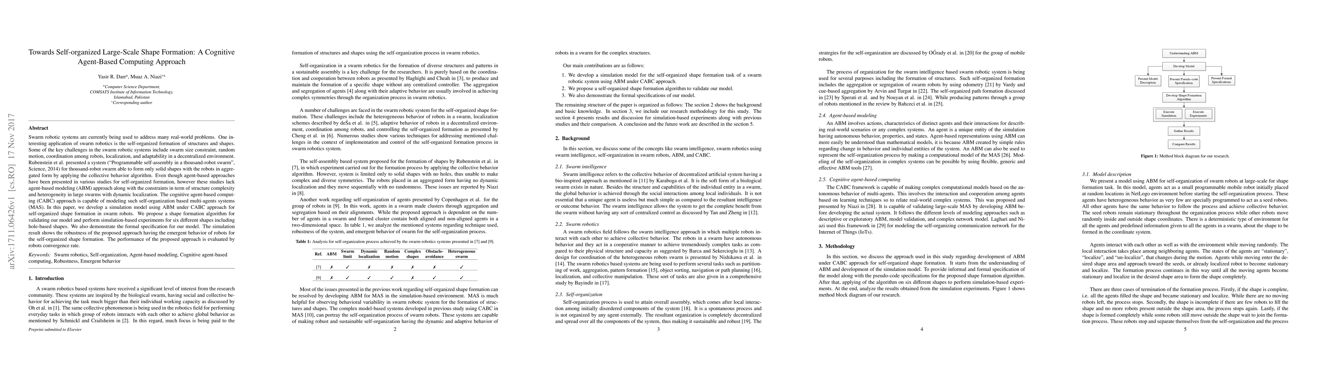 This paper develops a cognitive agent-based computing (CABC) approach for simulating self-organized shape formation in swarm robotic systems, proposing a new algorithm for emergent behavior. The simulation results demonstrate the robustness of the approach in forming complex shapes, including hole-based structures, with high convergence rates.