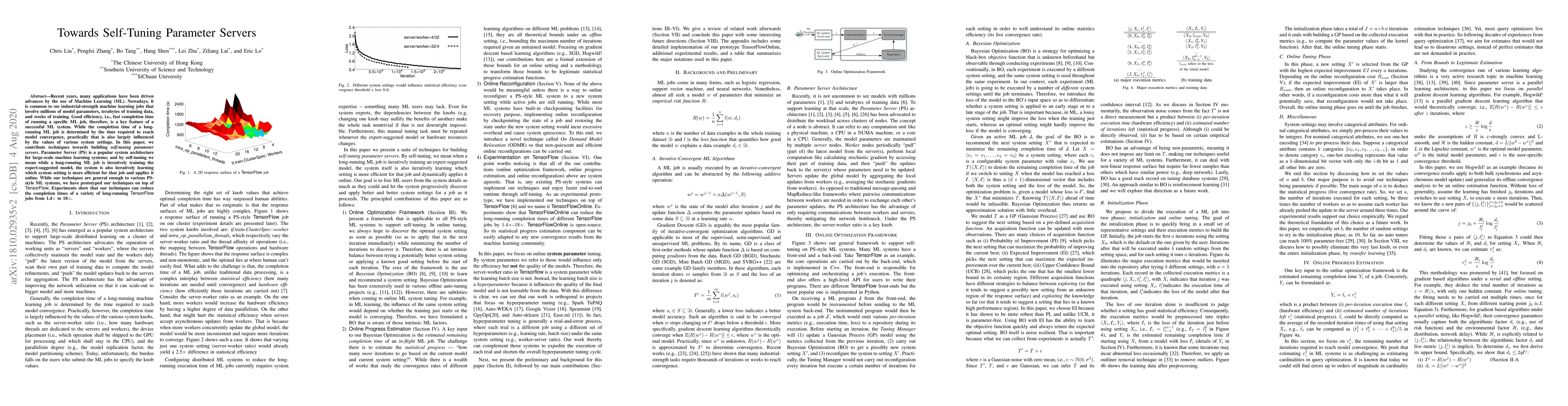 This paper proposes techniques for self-tuning parameter servers in machine learning systems to optimize efficiency during long-running training jobs. The self-tuning system adapts system settings in real-time to reduce job completion times, demonstrated through a prototype on TensorFlow, achieving reductions from 1.4x to 18x.