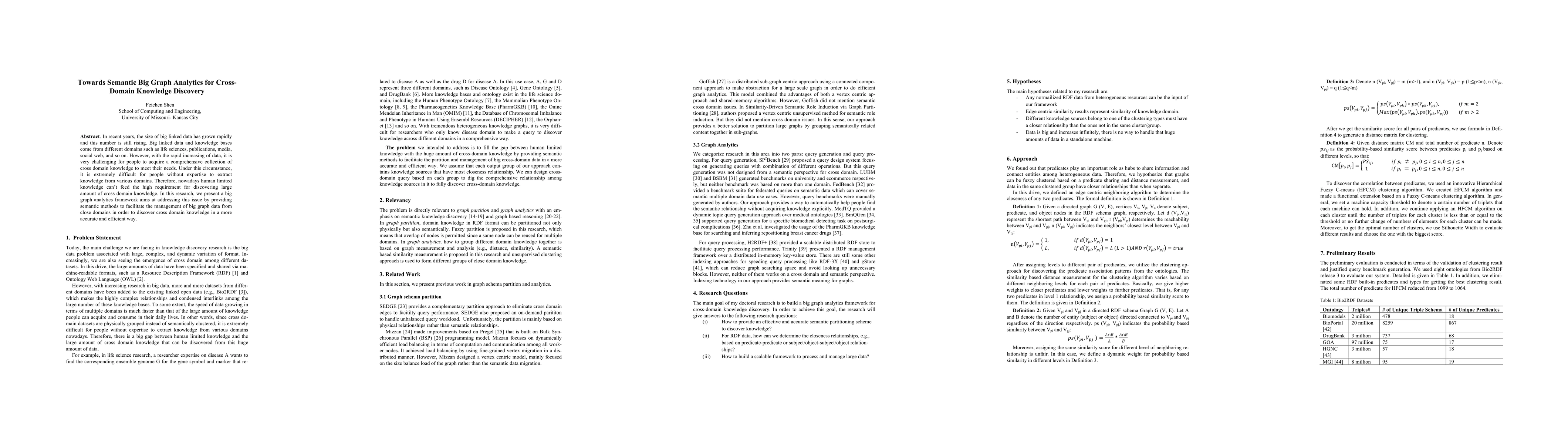 In recent years, the size of big linked data has grown rapidly and this number is still rising. Big linked data and knowledge bases come from different domains such as life sciences, publications, media, social web, and so on. However, with the rapid increasing of data, it is very challenging for people to acquire a comprehensive collection of cross domain knowledge to meet their needs. Under this circumstance, it is extremely difficult for people without expertise to extract knowledge from various domains. Therefore, nowadays human limited knowledge can't feed the high requirement for discovering large amount of cross domain knowledge. In this research, we present a big graph analytics framework aims at addressing this issue by providing semantic methods to facilitate the management of big graph data from close domains in order to discover cross domain knowledge in a more accurate and efficient way.