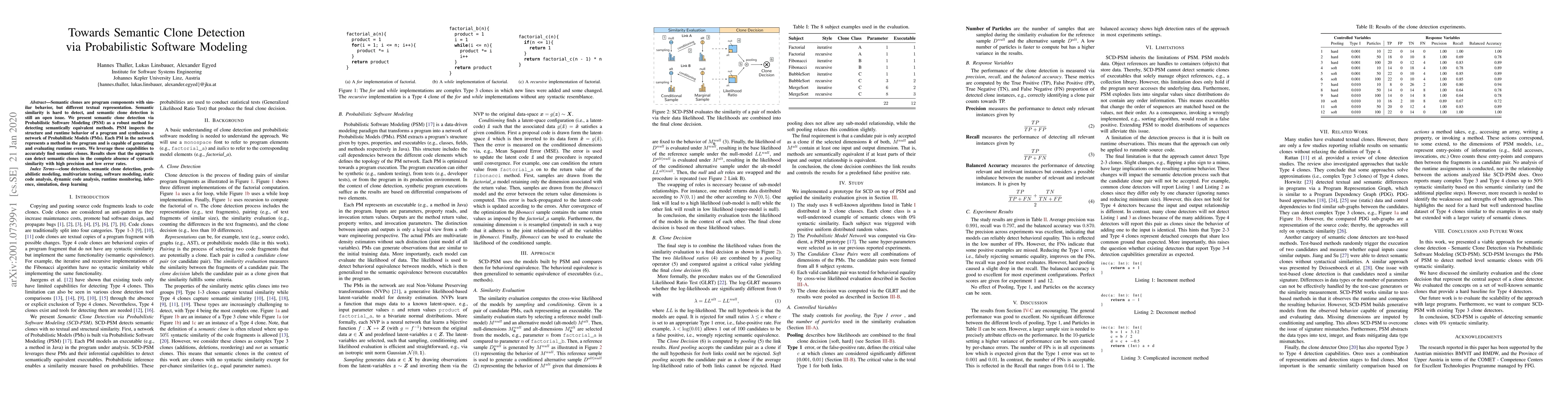 This paper proposes a Probabilistic Software Modeling (PSM) approach for detecting semantic clones—program components with similar behavior but different textual representation. PSM synthesizes a network of Probabilistic Models (PMs) that represent program methods, enabling the detection of semantically equivalent methods without reliance on syntactic similarity, yielding high precision and low error rates.