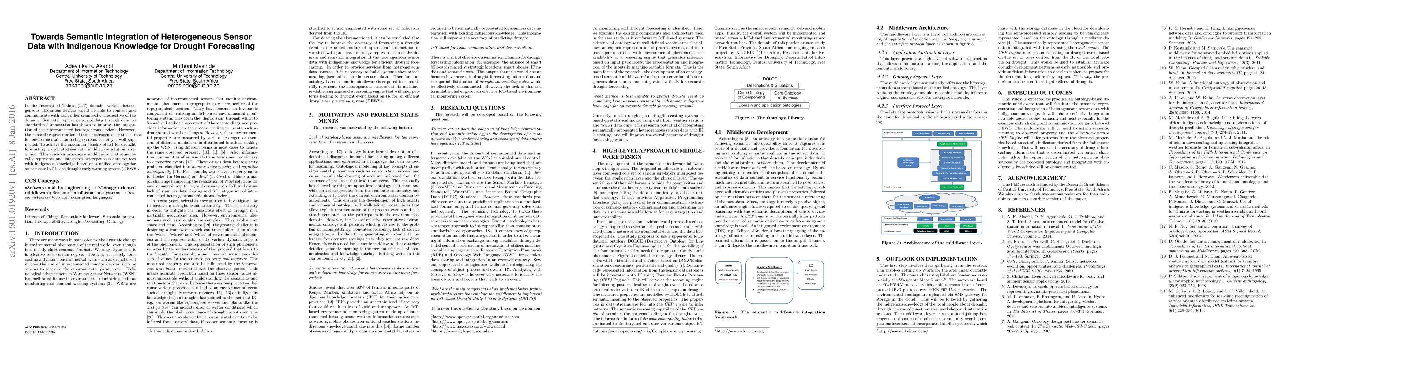 This research proposes a semantic middleware solution to integrate heterogeneous IoT sensor data with indigenous knowledge for improved drought forecasting. It aims to create a unified ontology to enhance the representation and integration of diverse data sources for an effective IoT-based drought early warning system.
