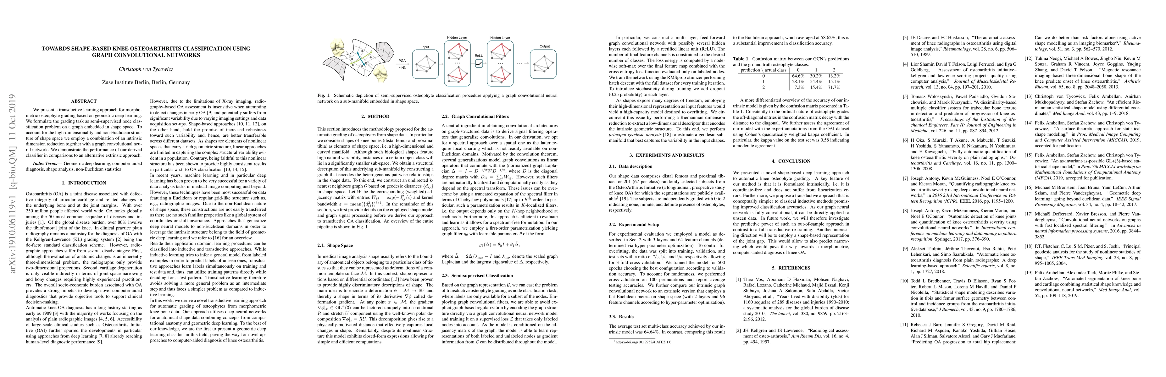 We present a transductive learning approach for morphometric osteophyte grading based on geometric deep learning. We formulate the grading task as semi-supervised node classification problem on a graph embedded in shape space. To account for the high-dimensionality and non-Euclidean structure of shape space we employ a combination of an intrinsic dimension reduction together with a graph convolutional neural network. We demonstrate the performance of our derived classifier in comparisons to an alternative extrinsic approach.