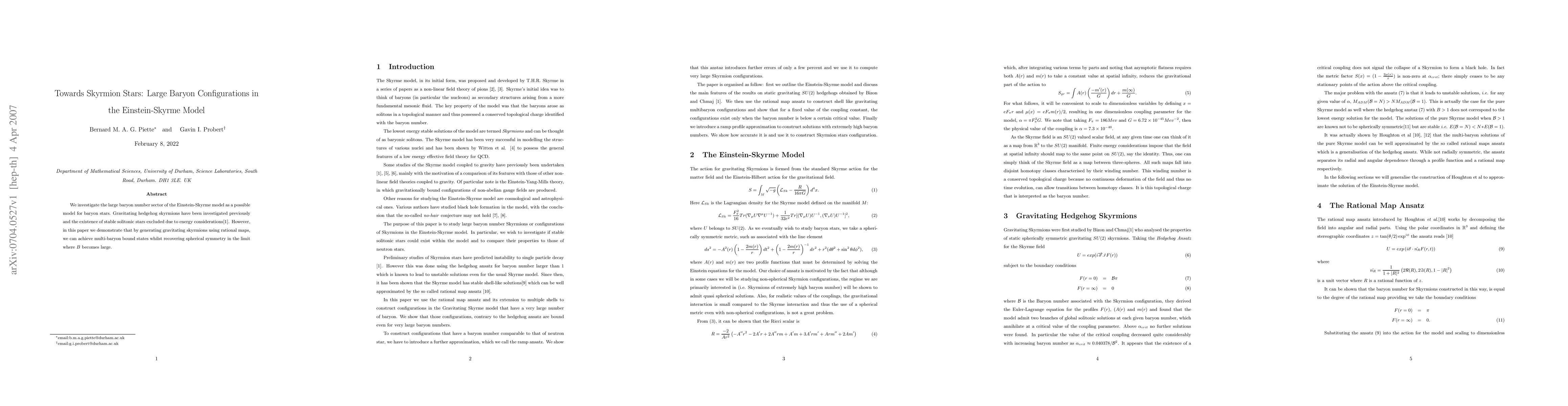 This paper explores the Einstein-Skyrme model for baryon stars, demonstrating that rational maps can generate gravitating skyrmions that form stable, multi-baryon bound states, maintaining spherical symmetry as the baryon number becomes large.
