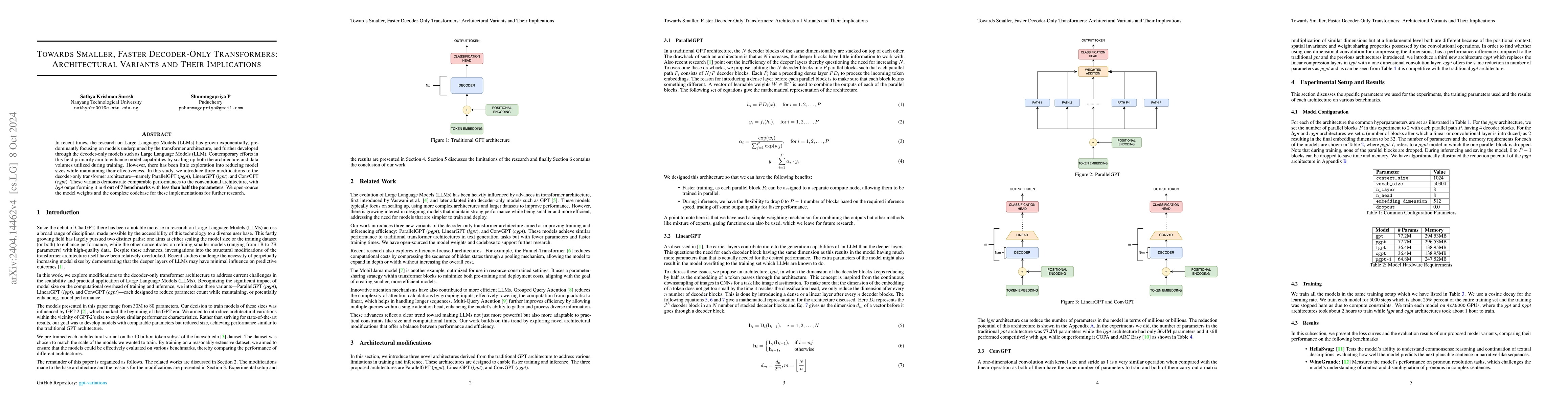 Research on Large Language Models (LLMs) has recently seen exponential growth, largely focused on transformer-based architectures, as introduced by [1] and further advanced by the decoder-only variations in [2]. Contemporary studies typically aim to improve model capabilities by increasing both the architecture's complexity and the volume of training data. However, research exploring how to reduce model sizes while maintaining performance is limited. This study introduces three modifications to the decoder-only transformer architecture: ParallelGPT (p-gpt), LinearlyCompressedGPT (lc-gpt), and ConvCompressedGPT (cc-gpt). These variants achieve comparable performance to conventional architectures in code generation tasks while benefiting from reduced model sizes and faster training times. We open-source the model weights and codebase to support future research and development in this domain.