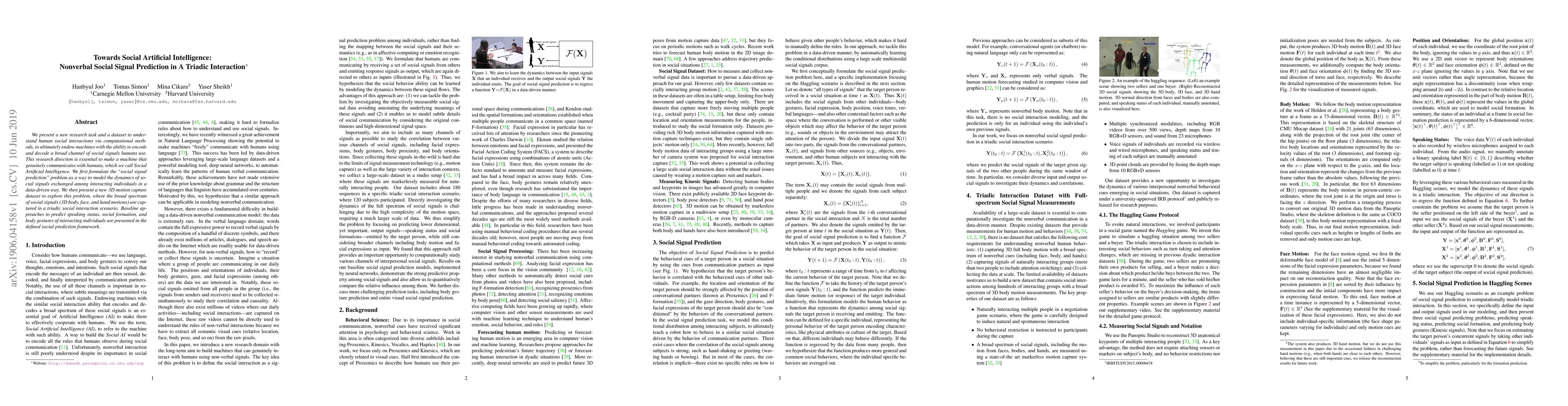 We present a new research task and a dataset to understand human social interactions via computational methods, to ultimately endow machines with the ability to encode and decode a broad channel of social signals humans use. This research direction is essential to make a machine that genuinely communicates with humans, which we call Social Artificial Intelligence. We first formulate the "social signal prediction" problem as a way to model the dynamics of social signals exchanged among interacting individuals in a data-driven way. We then present a new 3D motion capture dataset to explore this problem, where the broad spectrum of social signals (3D body, face, and hand motions) are captured in a triadic social interaction scenario. Baseline approaches to predict speaking status, social formation, and body gestures of interacting individuals are presented in the defined social prediction framework.