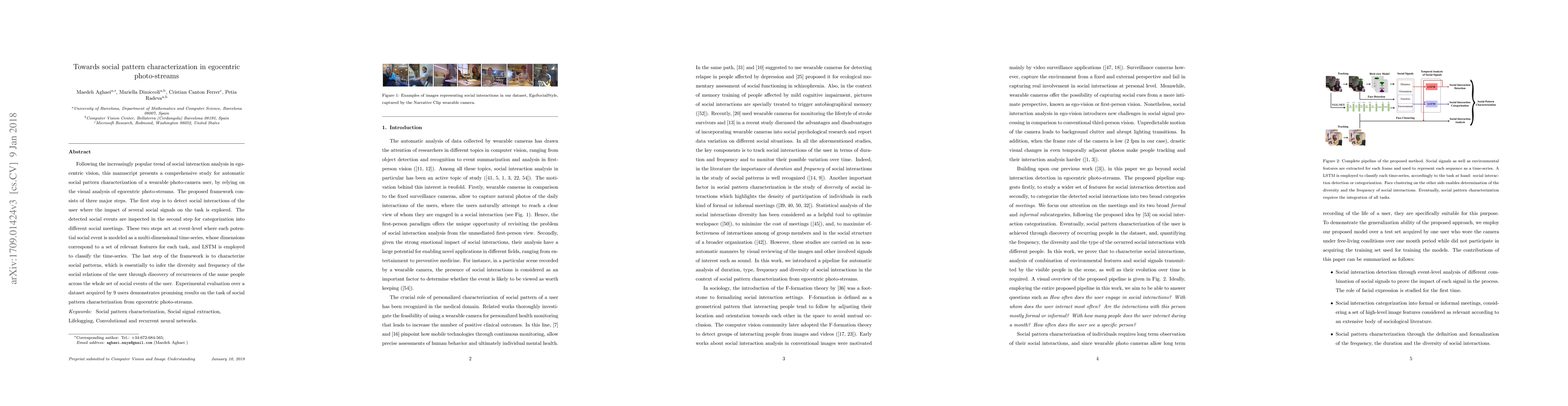 Following the increasingly popular trend of social interaction analysis in egocentric vision, this manuscript presents a comprehensive study for automatic social pattern characterization of a wearable photo-camera user, by relying on the visual analysis of egocentric photo-streams. The proposed framework consists of three major steps. The first step is to detect social interactions of the user where the impact of several social signals on the task is explored. The detected social events are inspected in the second step for categorization into different social meetings. These two steps act at event-level where each potential social event is modeled as a multi-dimensional time-series, whose dimensions correspond to a set of relevant features for each task, and LSTM is employed to classify the time-series. The last step of the framework is to characterize social patterns, which is essentially to infer the diversity and frequency of the social relations of the user through discovery of recurrences of the same people across the whole set of social events of the user. Experimental evaluation over a dataset acquired by 9 users demonstrates promising results on the task of social pattern characterization from egocentric photo-streams.
