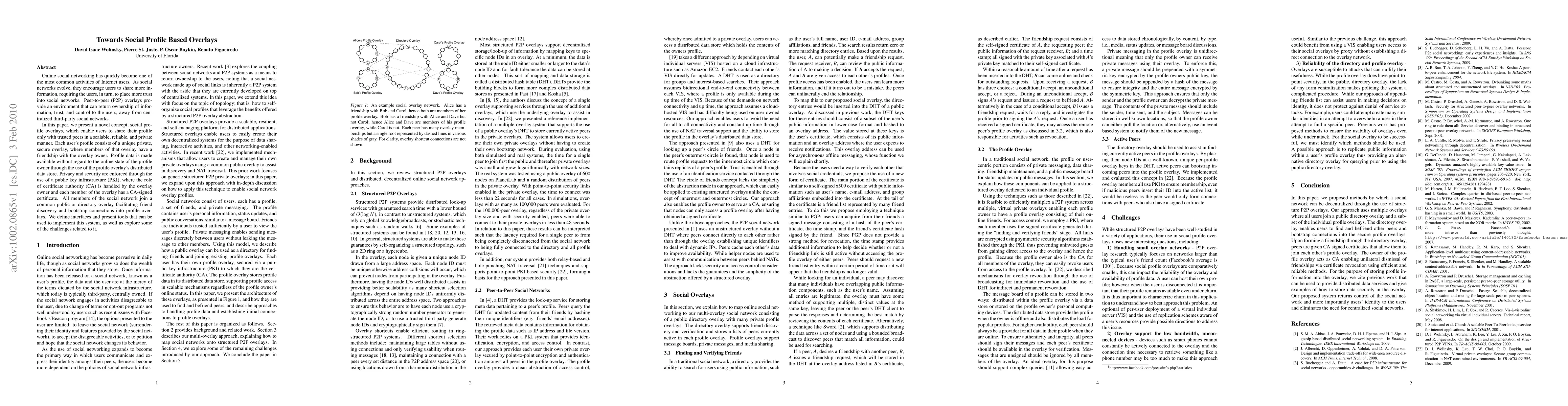 This paper introduces social profile overlays, a P2P system enabling users to privately share their social profiles with trusted peers, using a distributed data store and PKI for security. The system aims to shift control and trust away from centralized social networks.