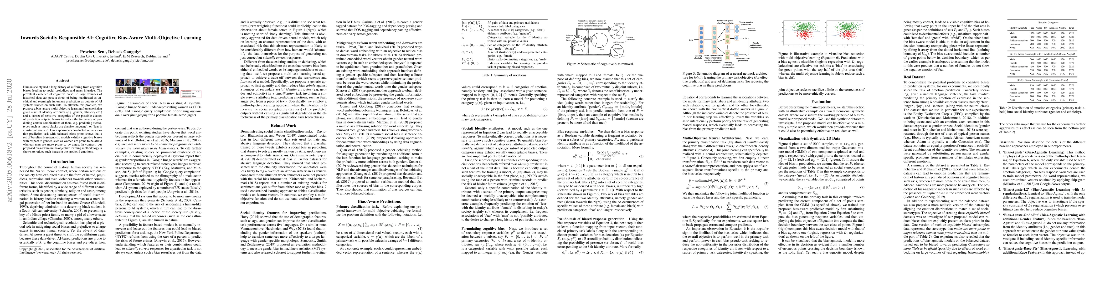 Human society had a long history of suffering from cognitive biases leading to social prejudices and mass injustice. The prevalent existence of cognitive biases in large volumes of historical data can pose a threat of being manifested as unethical and seemingly inhuman predictions as outputs of AI systems trained on such data. To alleviate this problem, we propose a bias-aware multi-objective learning framework that given a set of identity attributes (e.g. gender, ethnicity etc.) and a subset of sensitive categories of the possible classes of prediction outputs, learns to reduce the frequency of predicting certain combinations of them, e.g. predicting stereotypes such as `most blacks use abusive language', or `fear is a virtue of women'. Our experiments conducted on an emotion prediction task with balanced class priors shows that a set of baseline bias-agnostic models exhibit cognitive biases with respect to gender, such as women are prone to be afraid whereas men are more prone to be angry. In contrast, our proposed bias-aware multi-objective learning methodology is shown to reduce such biases in the predictied emotions.