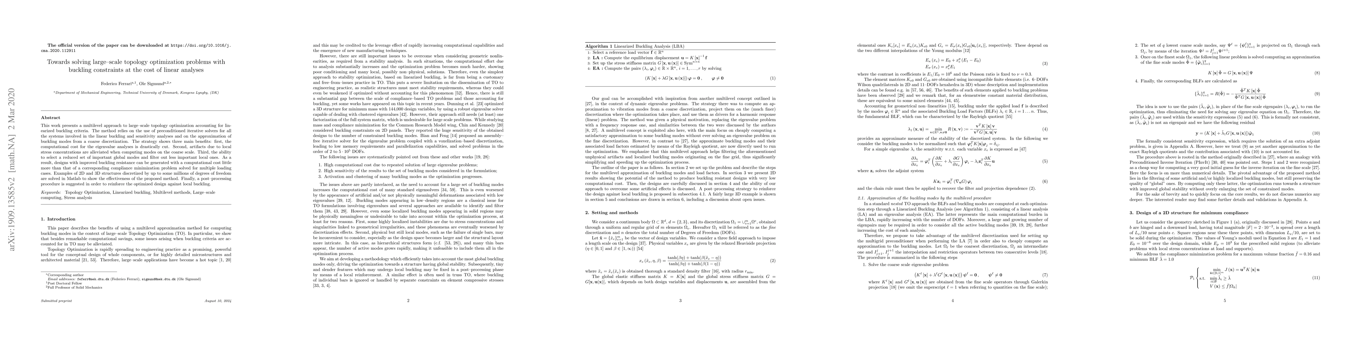 This paper proposes a multilevel approach for large-scale topology optimization that incorporates linearized buckling constraints, significantly reducing computational costs through preconditioned iterative solvers and coarse discretization approximations. The method enhances buckling resistance while maintaining a computational expense comparable to compliance minimization.