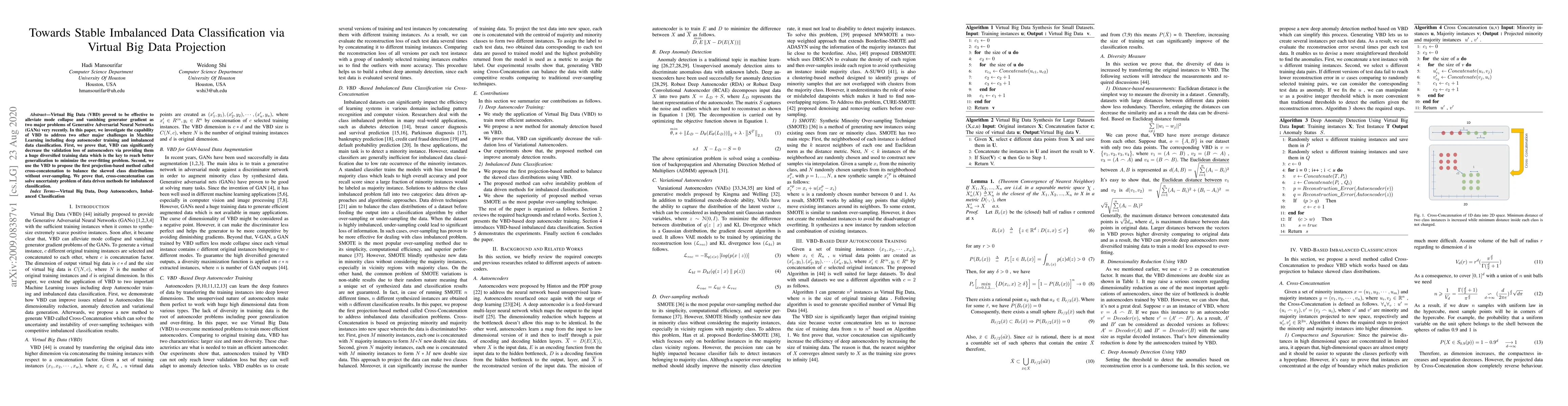 Virtual Big Data (VBD) proved to be effective to alleviate mode collapse and vanishing generator gradient as two major problems of Generative Adversarial Neural Networks (GANs) very recently. In this paper, we investigate the capability of VBD to address two other major challenges in Machine Learning including deep autoencoder training and imbalanced data classification. First, we prove that, VBD can significantly decrease the validation loss of autoencoders via providing them a huge diversified training data which is the key to reach better generalization to minimize the over-fitting problem. Second, we use the VBD to propose the first projection-based method called cross-concatenation to balance the skewed class distributions without over-sampling. We prove that, cross-concatenation can solve uncertainty problem of data driven methods for imbalanced classification.