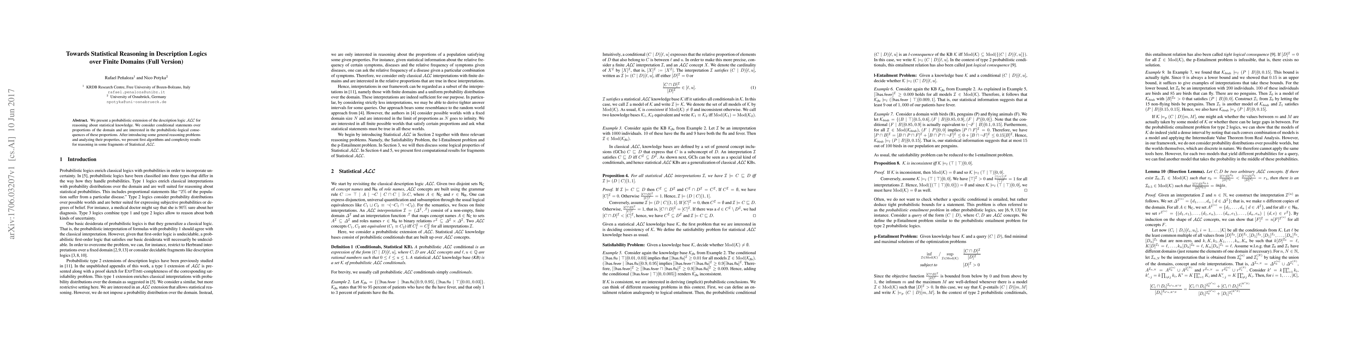 We present a probabilistic extension of the description logic $\mathcal{ALC}$ for reasoning about statistical knowledge. We consider conditional statements over proportions of the domain and are interested in the probabilistic-logical consequences of these proportions. After introducing some general reasoning problems and analyzing their properties, we present first algorithms and complexity results for reasoning in some fragments of Statistical $\mathcal{ALC}$.