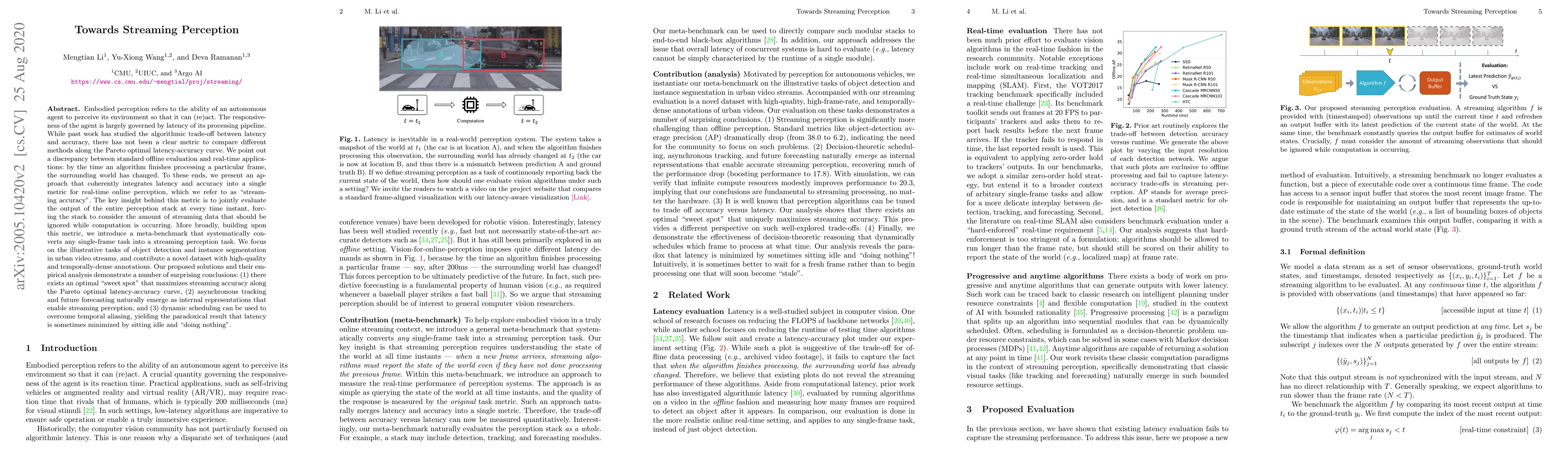 This paper proposes a new metric called "streaming accuracy" to evaluate real-time perception systems, emphasizing the integration of latency and accuracy in dynamic environments. It introduces a meta-benchmark to convert single-frame tasks into streaming perception tasks, demonstrating that optimal performance lies at a "sweet spot" balancing latency and accuracy, and that asynchronous tracking and dynamic scheduling are key to achieving this balance.