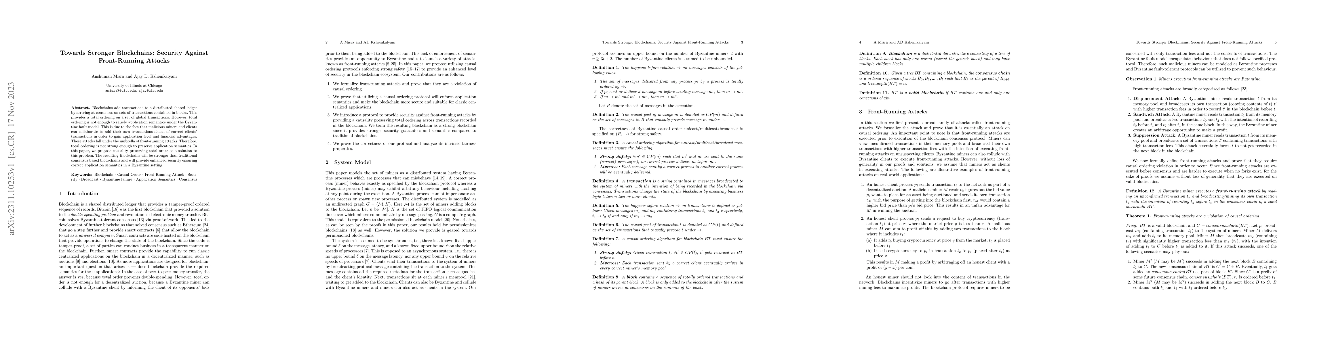This paper proposes a solution to front-running attacks in blockchains by introducing causality preserving total order, aiming to enhance security and ensure correct application semantics in a Byzantine fault model. Traditional consensus-based blockchains are insufficient for this purpose, but the proposed method promises stronger blockchains.