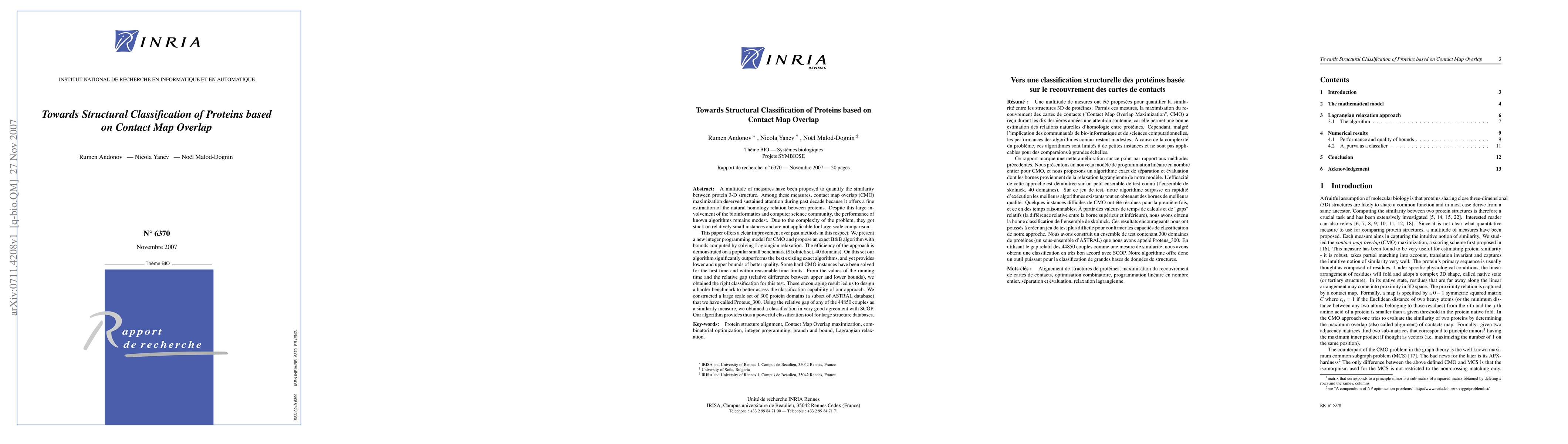 This paper proposes a new algorithm for classifying proteins based on contact map overlap, significantly outperforming existing methods in both small-scale and large-scale comparisons, providing a powerful tool for large structure databases.