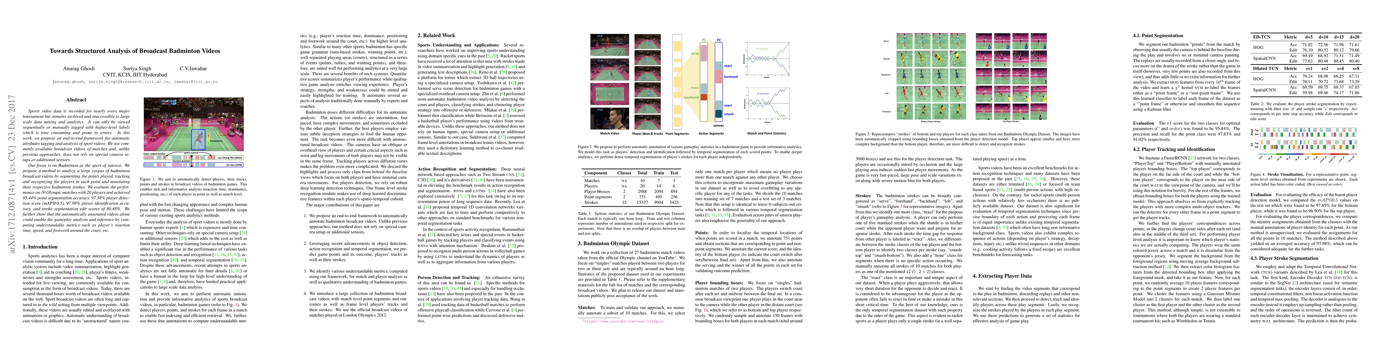 This paper proposes an end-to-end framework for automatic tagging and analysis of badminton broadcast videos, achieving high accuracy in point segmentation, player detection, and stroke recognition without requiring special equipment. The framework enables detailed gameplay analysis through computed metrics like reaction time and footwork.