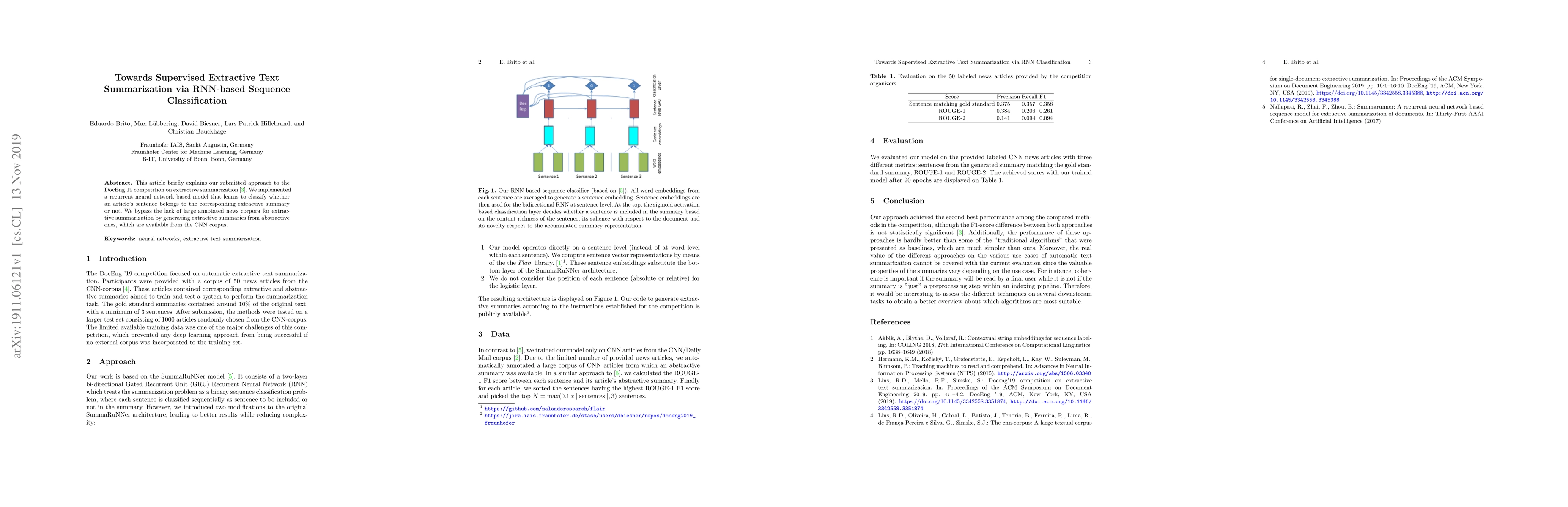 This article briefly explains our submitted approach to the DocEng'19 competition on extractive summarization. We implemented a recurrent neural network based model that learns to classify whether an article's sentence belongs to the corresponding extractive summary or not. We bypass the lack of large annotated news corpora for extractive summarization by generating extractive summaries from abstractive ones, which are available from the CNN corpus.