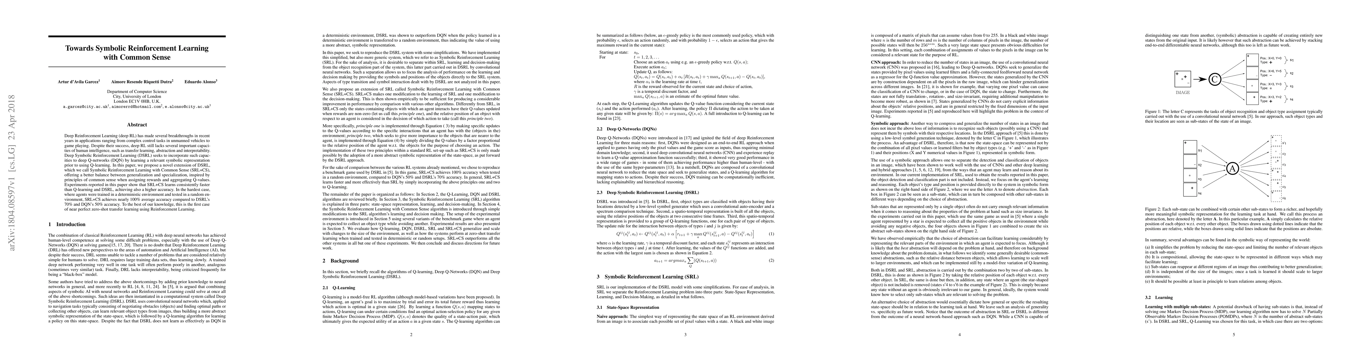 This paper proposes Symbolic Reinforcement Learning with Common Sense (SRL+CS), a novel extension of Deep Symbolic Reinforcement Learning that incorporates common sense principles to improve generalization and specialization. Experiments show SRL+CS learns faster and achieves higher accuracy, especially in zero-shot transfer scenarios, demonstrating nearly 100% accuracy compared to 70% and 50% for DSRL and DQN respectively.