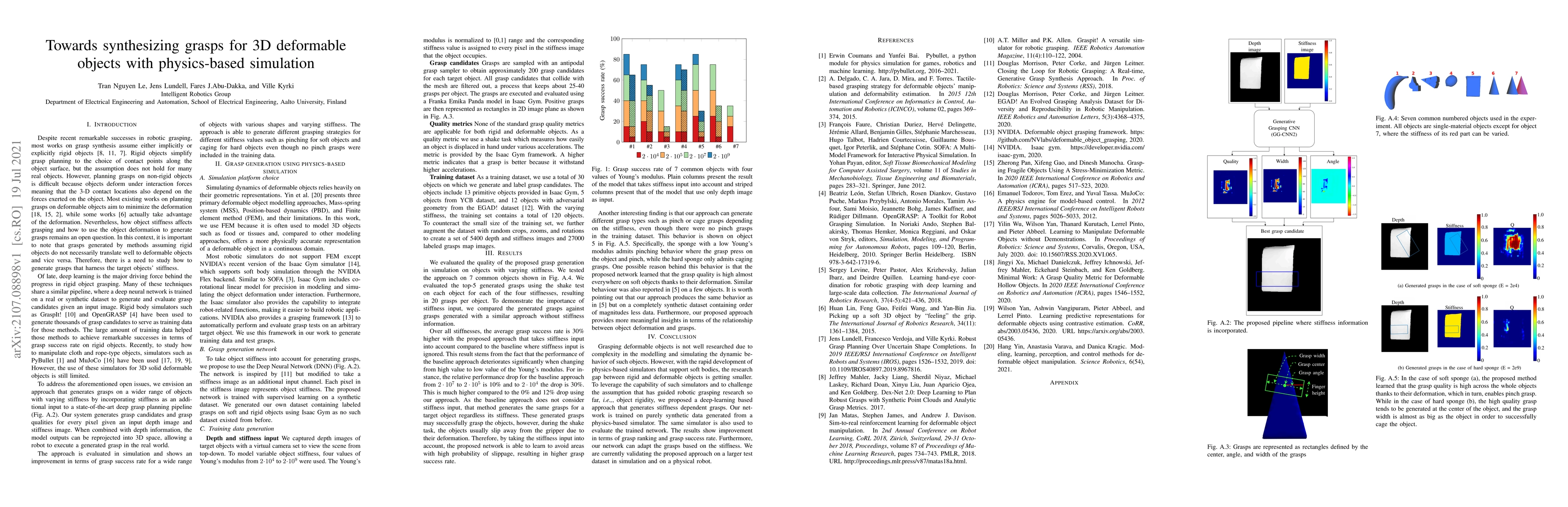 This paper proposes a deep-learning approach to generate stiffness-dependent grasps for 3D deformable objects using physics-based simulation, aiming to bridge the research gap between rigid and deformable objects. The trained network shows improved grasp ranking and success rate, and is currently being validated on a larger dataset and a physical robot.