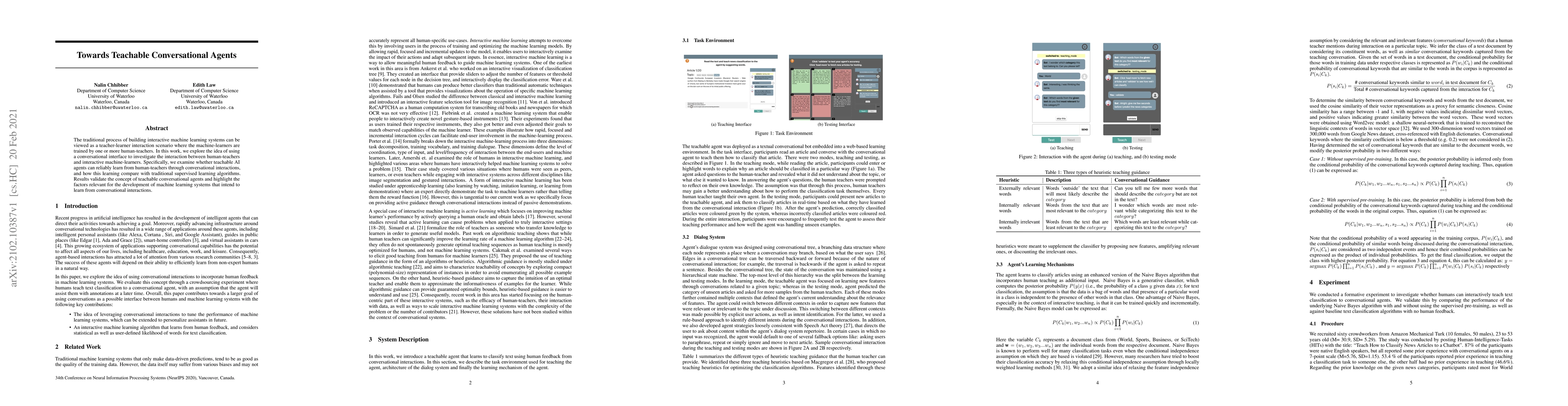 This paper investigates the potential of conversational interfaces for training interactive machine learning systems, demonstrating that teachable AI agents can effectively learn from human-teachers through dialogue, and compares this method to traditional supervised learning, highlighting key factors for developing such systems.