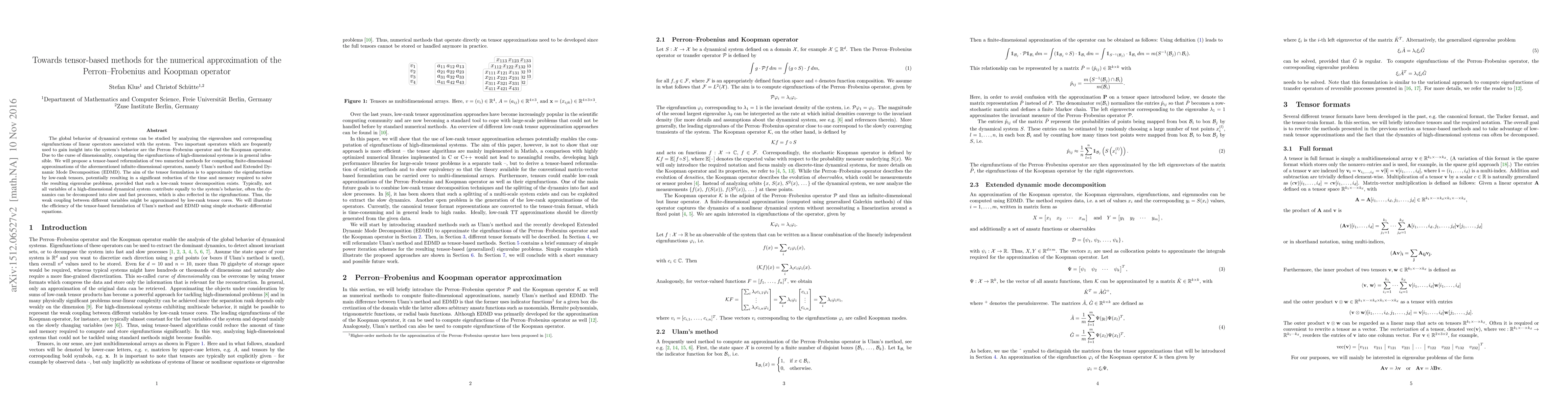The global behavior of dynamical systems can be studied by analyzing the eigenvalues and corresponding eigenfunctions of linear operators associated with the system. Two important operators which are frequently used to gain insight into the system's behavior are the Perron-Frobenius operator and the Koopman operator. Due to the curse of dimensionality, computing the eigenfunctions of high-dimensional systems is in general infeasible. We will propose a tensor-based reformulation of two numerical methods for computing finite-dimensional approximations of the aforementioned infinite-dimensional operators, namely Ulam's method and Extended Dynamic Mode Decomposition (EDMD). The aim of the tensor formulation is to approximate the eigenfunctions by low-rank tensors, potentially resulting in a significant reduction of the time and memory required to solve the resulting eigenvalue problems, provided that such a low-rank tensor decomposition exists. Typically, not all variables of a high-dimensional dynamical system contribute equally to the system's behavior, often the dynamics can be decomposed into slow and fast processes, which is also reflected in the eigenfunctions. Thus, the weak coupling between different variables might be approximated by low-rank tensor cores. We will illustrate the efficiency of the tensor-based formulation of Ulam's method and EDMD using simple stochastic differential equations.