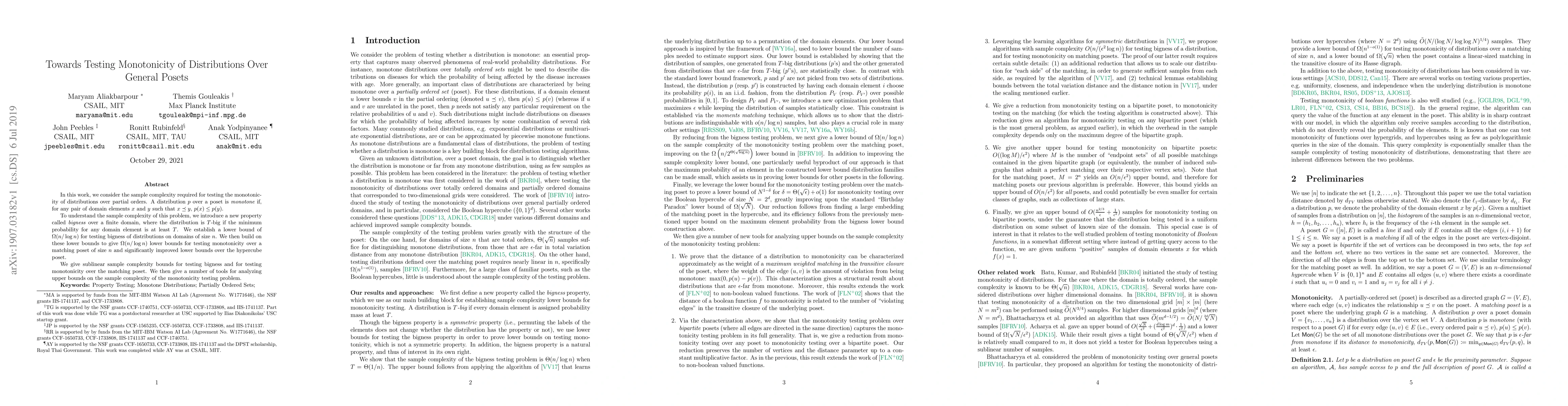 In this work, we consider the sample complexity required for testing the monotonicity of distributions over partial orders. A distribution $p$ over a poset is monotone if, for any pair of domain elements $x$ and $y$ such that $x \preceq y$, $p(x) \leq p(y)$. To understand the sample complexity of this problem, we introduce a new property called bigness over a finite domain, where the distribution is $T$-big if the minimum probability for any domain element is at least $T$. We establish a lower bound of $\Omega(n/\log n)$ for testing bigness of distributions on domains of size $n$. We then build on these lower bounds to give $\Omega(n/\log{n})$ lower bounds for testing monotonicity over a matching poset of size $n$ and significantly improved lower bounds over the hypercube poset. We give sublinear sample complexity bounds for testing bigness and for testing monotonicity over the matching poset. We then give a number of tools for analyzing upper bounds on the sample complexity of the monotonicity testing problem.