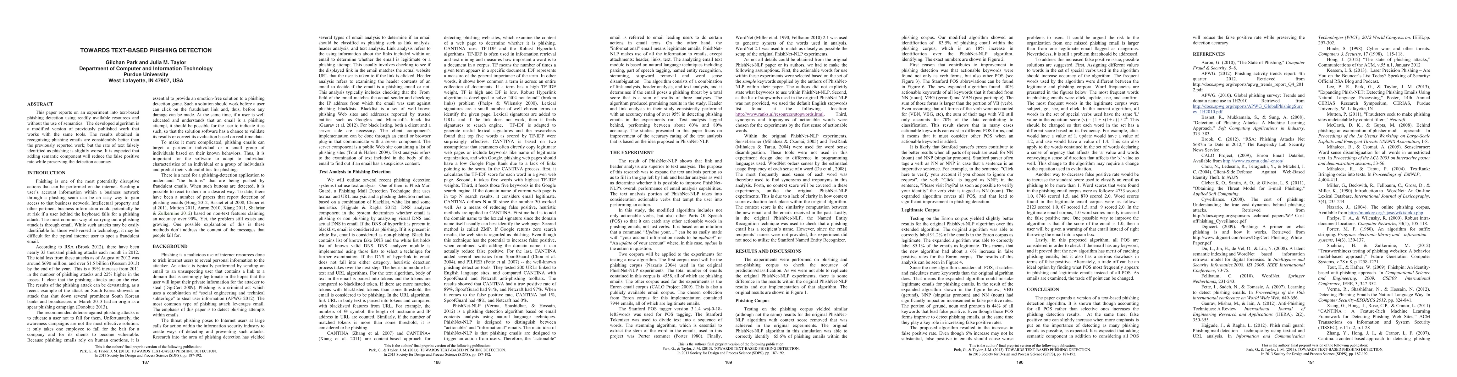 This paper presents an improved text-based phishing detection algorithm, achieving better recognition of phishing emails compared to previous methods, though with a slight increase in false positives. The authors suggest that incorporating semantics could lower false positives while maintaining detection accuracy.