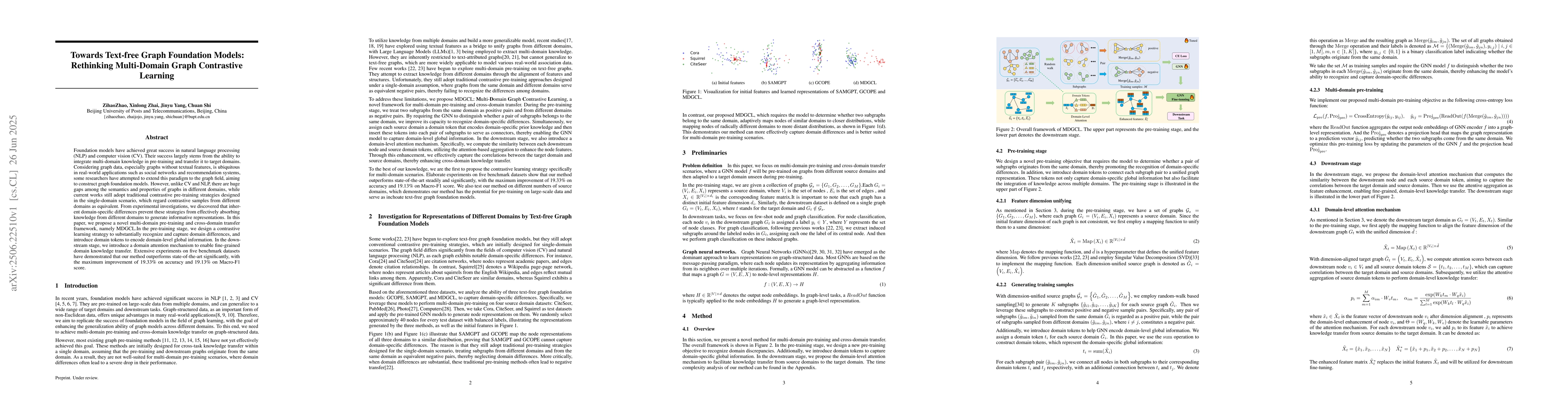 Foundation models have achieved great success in natural language processing (NLP) and computer vision (CV). Their success largely stems from the ability to integrate multi-domain knowledge in pre-training and transfer it to target domains. Considering graph data, especially graphs without textual features, is ubiquitous in real-world applications such as social networks and recommendation systems, some researchers have attempted to extend this paradigm to the graph field, aiming to construct graph foundation models. However, unlike CV and NLP, there are huge gaps among the semantics and properties of graphs in different domains, while current works still adopt traditional contrastive pre-training strategies designed in the single-domain scenario, which regard contrastive samples from different domains as equivalent. From experimental investigations, we discovered that inherent domain-specific differences prevent these strategies from effectively absorbing knowledge from different domains to generate informative representations. In this paper, we propose a novel multi-domain pre-training and cross-domain transfer framework, namely MDGCL.In the pre-training stage, we design a contrastive learning strategy to substantially recognize and capture domain differences, and introduce domain tokens to encode domain-level global information. In the downstream stage, we introduce a domain attention mechanism to enable fine-grained domain knowledge transfer. Extensive experiments on five benchmark datasets have demonstrated that our method outperforms state-of-the-art significantly, with the maximum improvement of 19.33\% on accuracy and 19.13\% on Macro-F1 score.