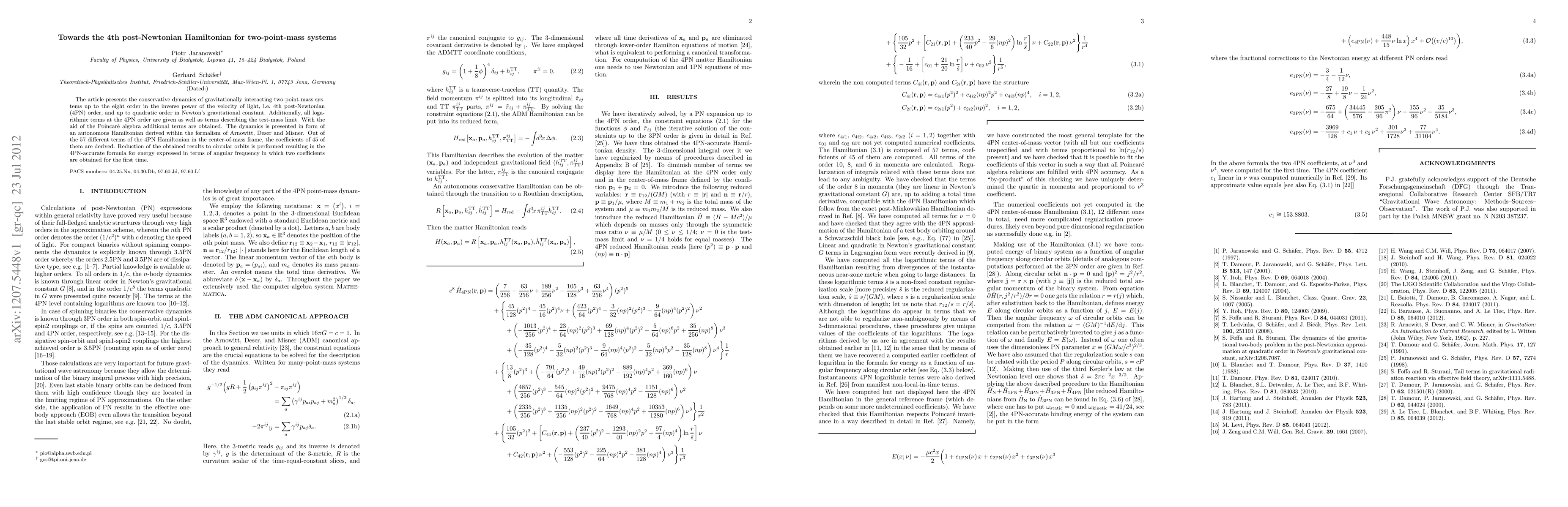 The article presents the conservative dynamics of gravitationally interacting two-point-mass systems up to the eight order in the inverse power of the velocity of light, i.e.\ 4th post-Newtonian (4PN) order, and up to quadratic order in Newton's gravitational constant. Additionally, all logarithmic terms at the 4PN order are given as well as terms describing the test-mass limit. With the aid of the Poincar\'e algebra additional terms are obtained. The dynamics is presented in form of an autonomous Hamiltonian derived within the formalism of Arnowitt, Deser and Misner. Out of the 57 different terms of the 4PN Hamiltonian in the center-of-mass frame, the coefficients of 45 of them are derived. Reduction of the obtained results to circular orbits is performed resulting in the 4PN-accurate formula for energy expressed in terms of angular frequency in which two coefficients are obtained for the first time.