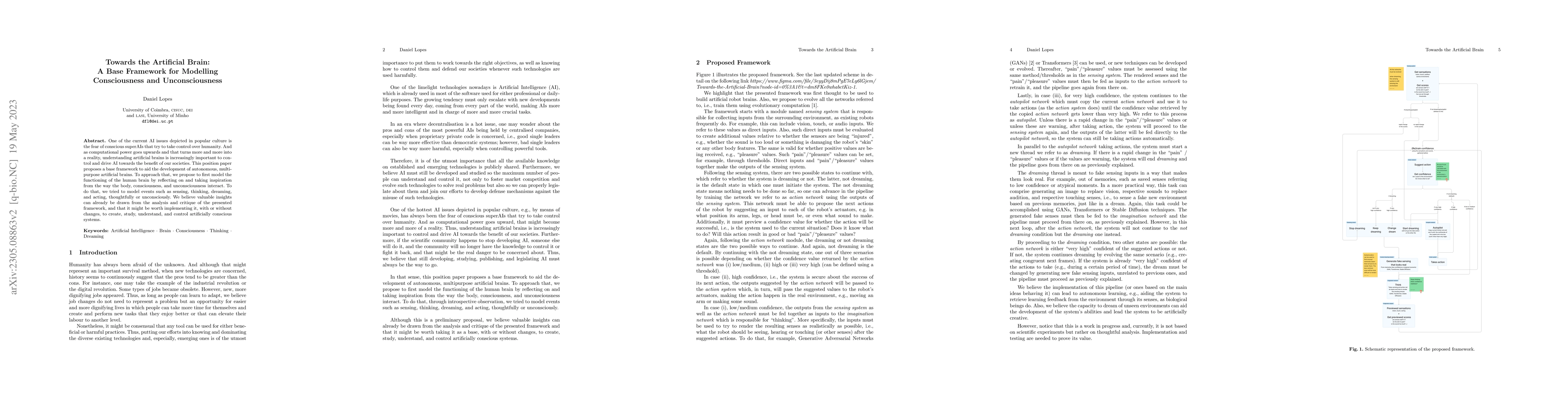 One of the current AI issues depicted in popular culture is the fear of conscious super AIs that try to take control over humanity. And as computational power goes upwards and that turns more and more into a reality, understanding artificial brains might be increasingly important to control and drive AI towards the benefit of our societies. This paper proposes a base framework to aid the development of autonomous multipurpose artificial brains. To approach that, we propose to first model the functioning of the human brain by reflecting and taking inspiration from the way the body, the consciousness and the unconsciousness interact. To do that, we tried to model events such as sensing, thinking, dreaming and acting, thoughtfully or unconsciously. We believe valuable insights can already be drawn from the analysis and critique of the presented framework, and that it might be worth implementing it, with or without changes, to create, study, understand and control artificially conscious systems.