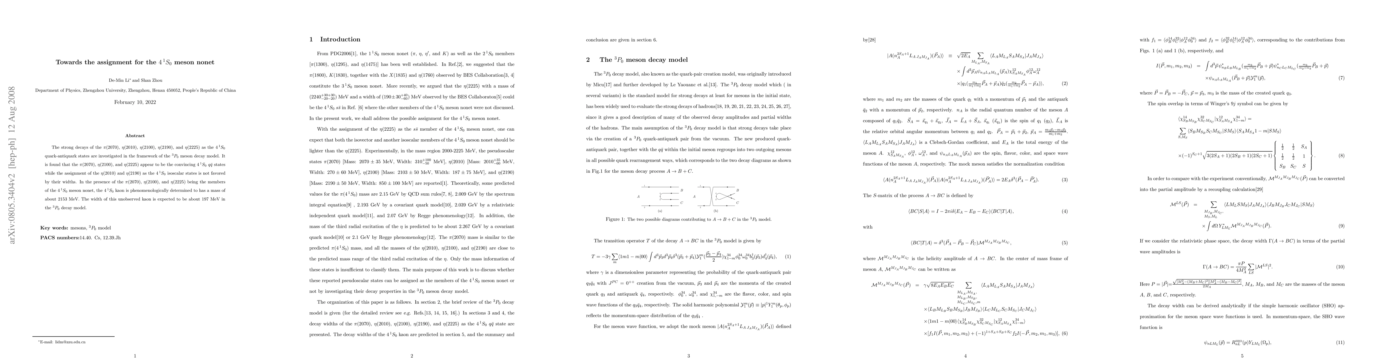 The strong decays of the $\pi(2070)$, $\eta(2010)$, $\eta(2100)$, $\eta(2190)$, and $\eta(2225)$ as the $4 ^1S_0$ quark-antiquark states are investigated in the framework of the $^3P_0$ meson decay model. It is found that the $\pi(2070)$, $\eta(2100)$, and $\eta(2225)$ appear to be the convincing $4 ^1S_0$ $q\bar{q}$ states while the assignment of the $\eta(2010)$ and $\eta(2190)$ as the $4 ^1S_0$ isoscalar states is not favored by their widths. In the presence of the $\pi(2070)$, $\eta(2100)$, and $\eta(2225)$ being the members of the $4 ^1S_0$ meson nonet, the $4 ^1S_0$ kaon is phenomenologically determined to has a mass of about 2153 MeV. The width of this unobserved kaon is expected to be about 197 MeV in the $^3P_0$ decay model.