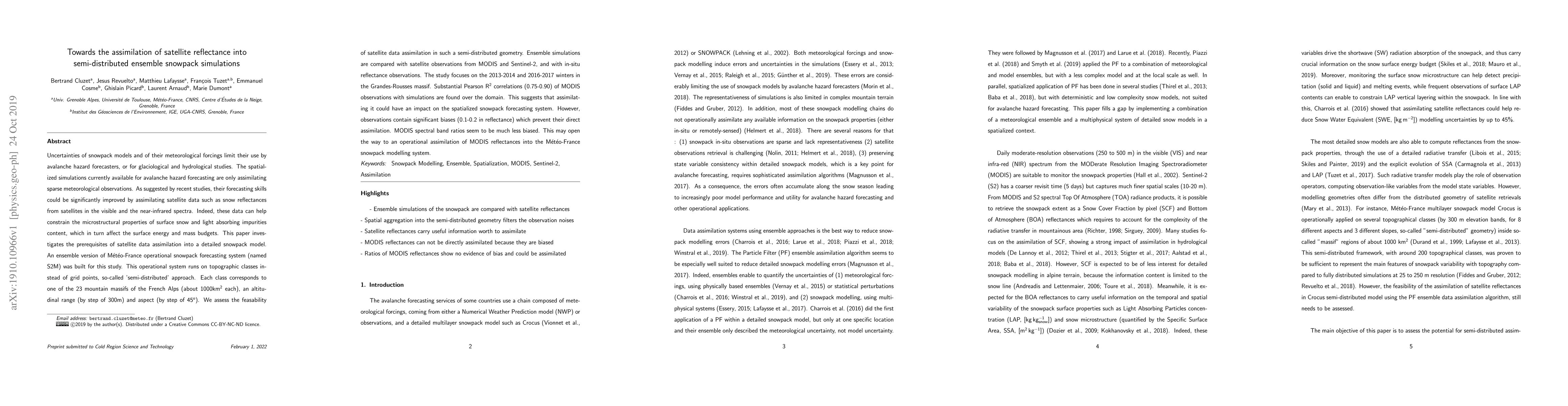 This paper explores the feasibility of integrating satellite reflectance data into a semi-distributed ensemble snowpack model for improved avalanche hazard forecasting. The study finds promising correlations between satellite observations and model simulations but highlights significant biases in the reflectance data that need to be addressed before direct assimilation.