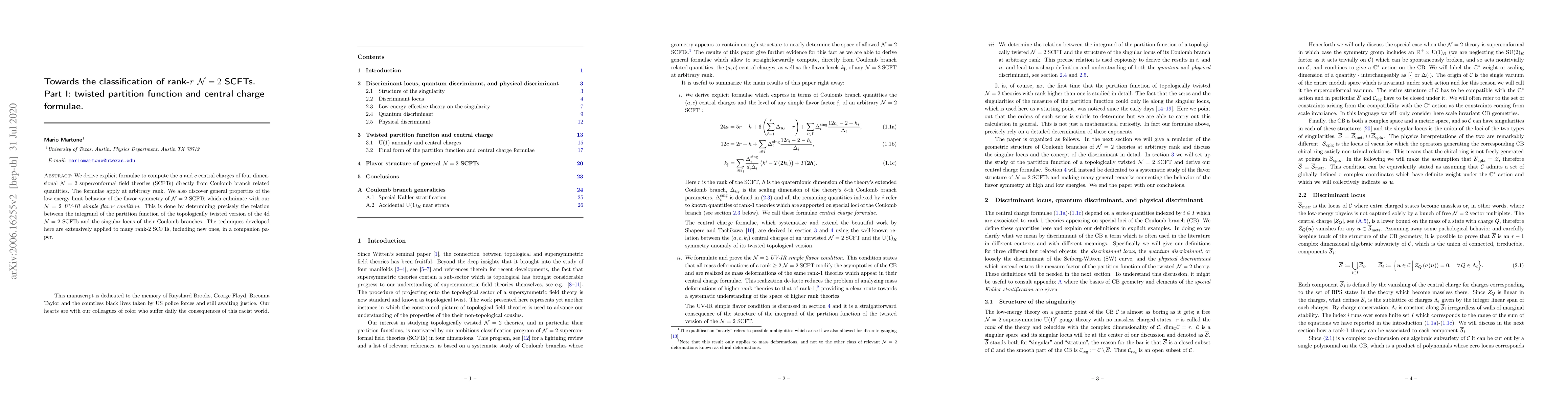 We derive explicit formulae to compute the $a$ and $c$ central charges of four dimensional $\mathcal{N}=2$ superconformal field theories (SCFTs) directly from Coulomb branch related quantities. The formulae apply at arbitrary rank. We also discover general properties of the low-energy limit behavior of the flavor symmetry of $\mathcal{N}=2$ SCFTs which culminate with our $\mathcal{N}=2$ UV-IR simple flavor condition. This is done by determining precisely the relation between the integrand of the partition function of the topologically twisted version of the 4d $\mathcal{N}=2$ SCFTs and the singular locus of their Coulomb branches. The techniques developed here are extensively applied to many rank-2 SCFTs, including new ones, in a companion paper.