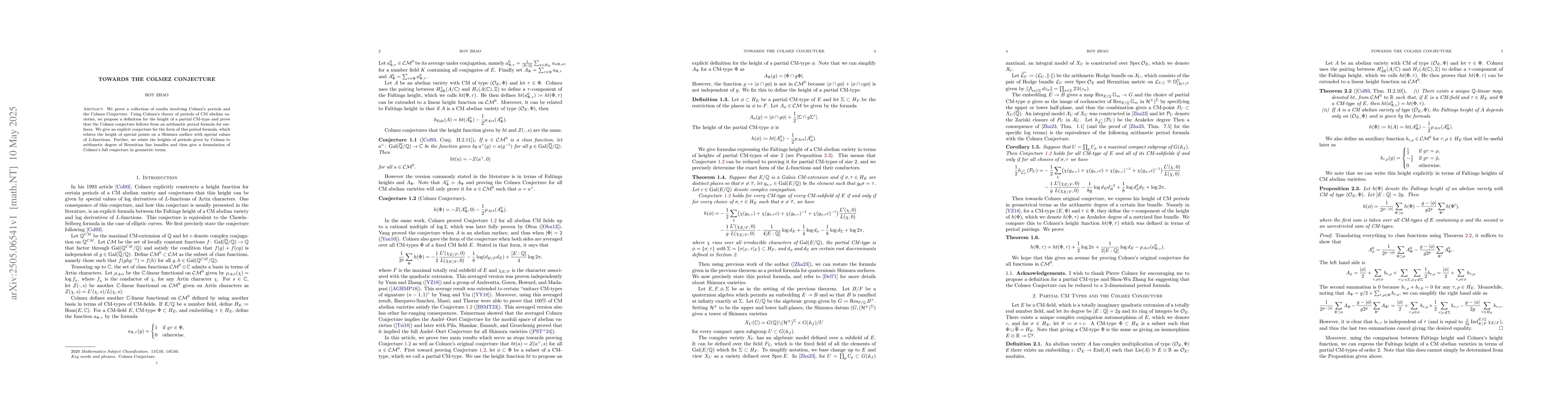 The paper employs Colmez's theory of periods of CM abelian varieties to propose a definition for the height of a partial CM-type and proves the Colmez conjecture through an arithmetic period formula for surfaces.