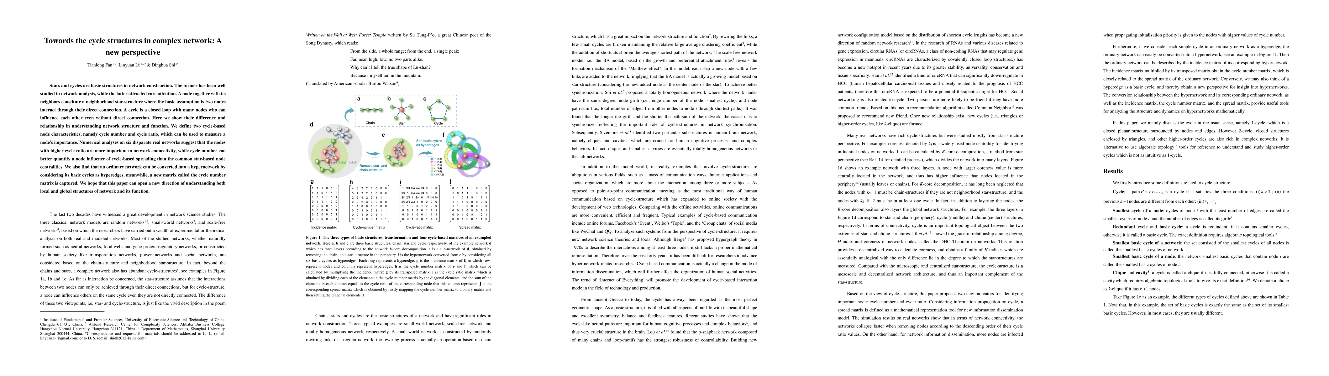 Stars and cycles are basic structures in network construction. The former has been well studied in network analysis, while the latter attracted rare attention. A node together with its neighbors constitute a neighborhood star-structure where the basic assumption is two nodes interact through their direct connection. A cycle is a closed loop with many nodes who can influence each other even without direct connection. Here we show their difference and relationship in understanding network structure and function. We define two cycle-based node characteristics, namely cycle number and cycle ratio, which can be used to measure a node's importance. Numerical analyses on six disparate real networks suggest that the nodes with higher cycle ratio are more important to network connectivity, while cycle number can better quantify a node influence of cycle-based spreading than the common star-based node centralities. We also find that an ordinary network can be converted into a hypernetwork by considering its basic cycles as hyperedges, meanwhile, a new matrix called the cycle number matrix is captured. We hope that this paper can open a new direction of understanding both local and global structures of network and its function.