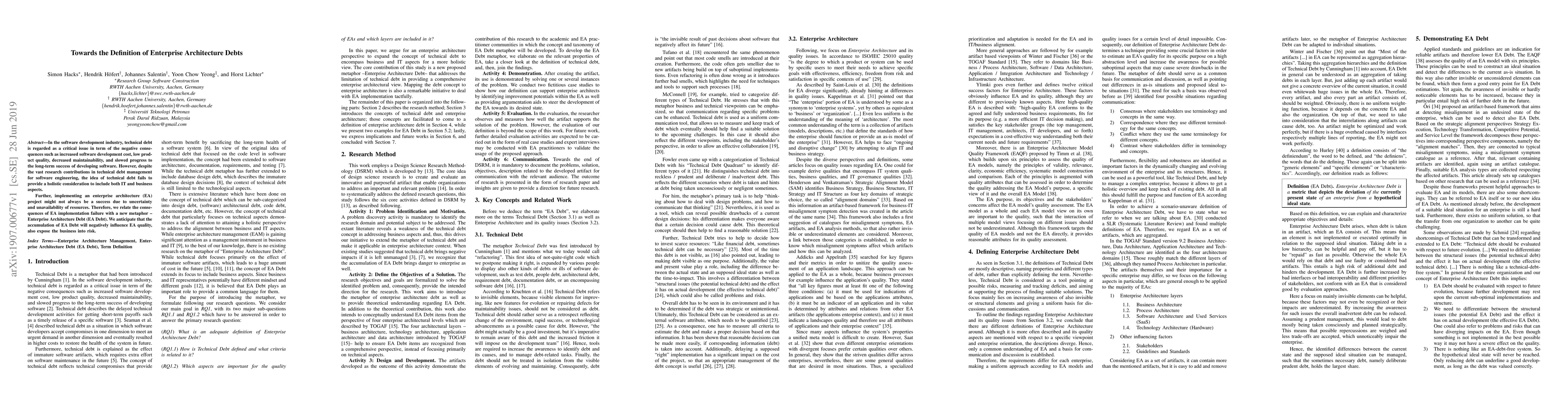 In the software development industry, technical debt is regarded as a critical issue in term of the negative consequences such as increased software development cost, low product quality, decreased maintainability, and slowed progress to the long-term success of developing software. However, despite the vast research contributions in technical debt management for software engineering, the idea of technical debt fails to provide a holistic consideration to include both IT and business aspects. Further, implementing an enterprise architecture (EA) project might not always be a success due to uncertainty and unavailability of resources. Therefore, we relate the consequences of EA implementation failure with a new metaphor --Enterprise Architecture Debt (EA Debt). We anticipate that the accumulation of EA Debt will negatively influence EA quality, also expose the business into risk.