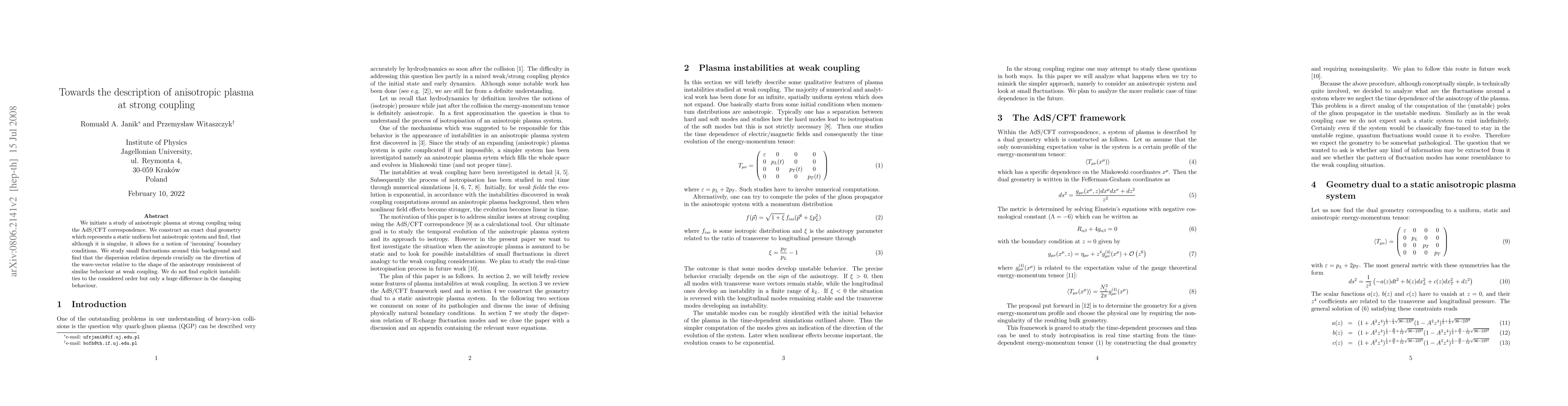 Researchers study anisotropic plasma at strong coupling using AdS/CFT correspondence, finding that fluctuations depend on wave-vector direction relative to anisotropy shape, leading to significant differences in damping behavior.